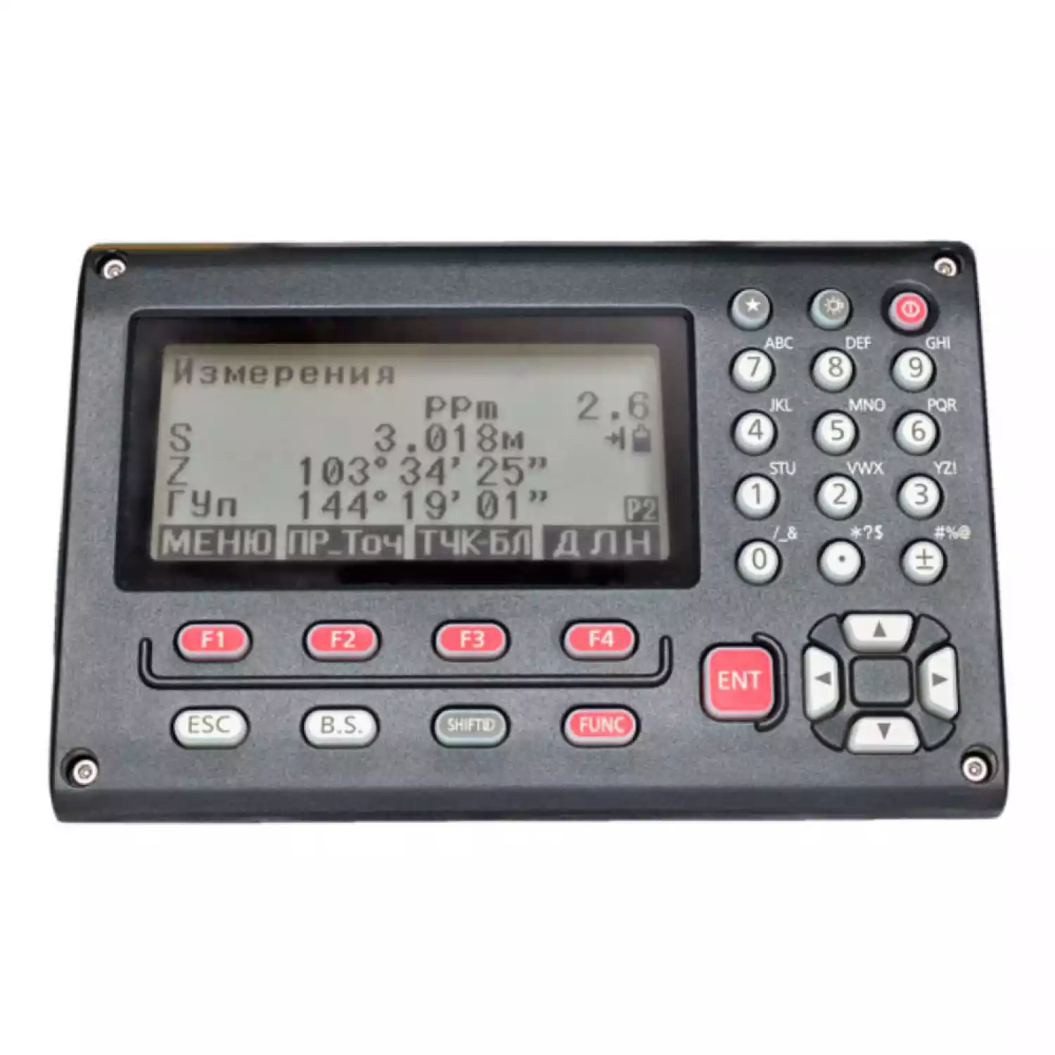 Управление дисплеем и функциями тахеометра обеспечивается за счет функциональных клавиш. С их помощью, вы можете выбирать пункты меню, отменять последнюю операцию, включать подсветку и настраивать тахеометр.
