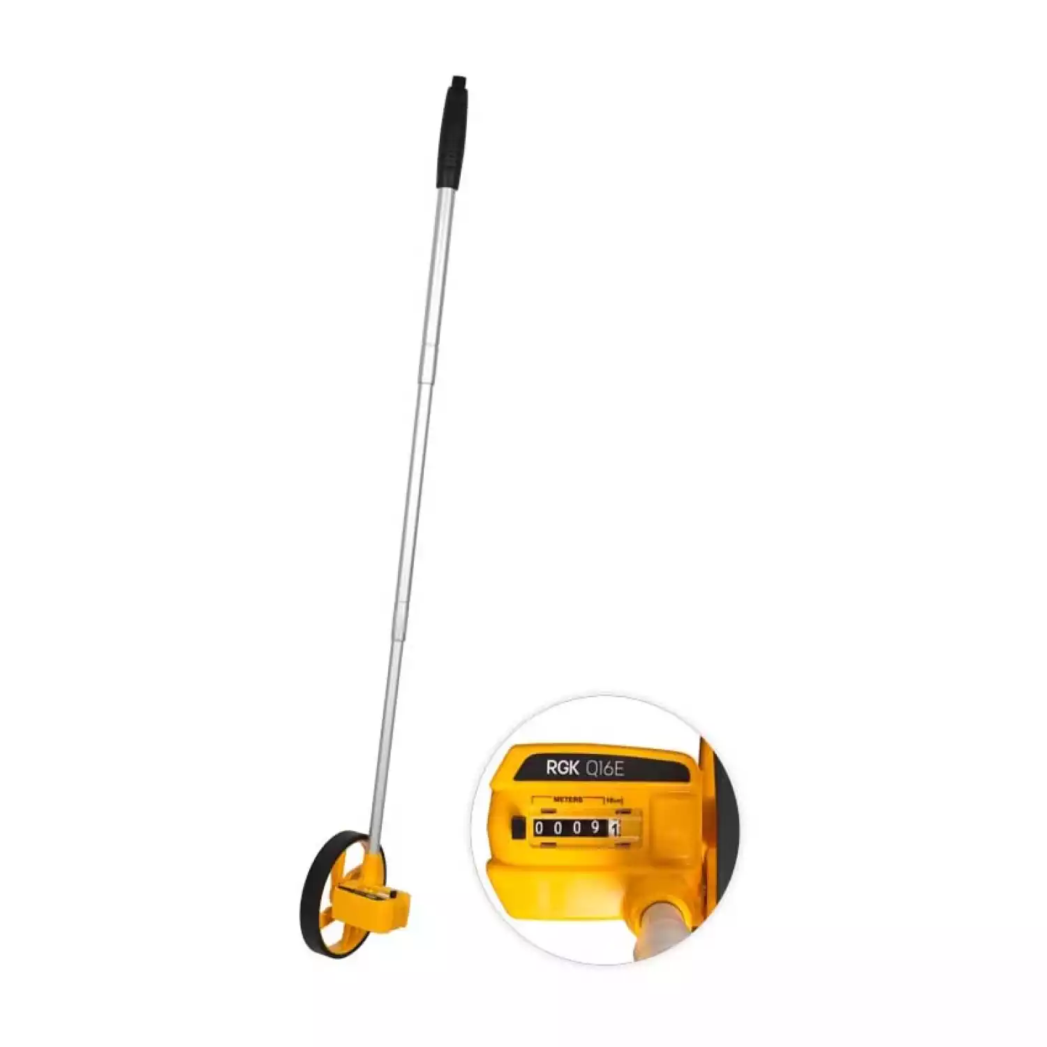 Дорожное колесо RGK Q16E диаметром 160 мм изготовлено из алюминиевого сплава и имеет меньший вес, по сравнению с похожим прибором RGK Q16. Прибор удобен при измерениях при неблагоприятных погодных условиях за счет надежного механического счетчика.