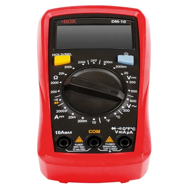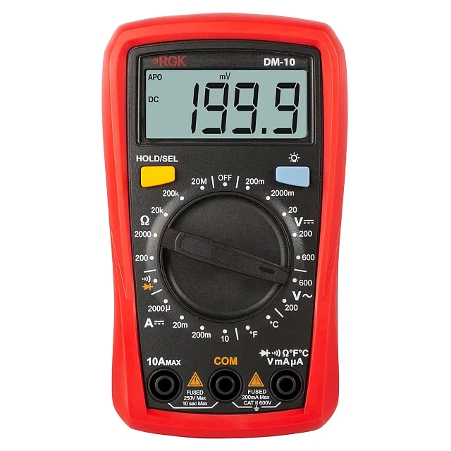 Цифровой мультиметр RGK DM-10 – это прибор для измерения различных параметров электросетей, диагностики оборудования, проверки диодов на работоспособность и прозвонки цепей. При подключении комплектной или любой другой термопары типа «К» эта модель может проводить замеры температуры вплоть до + 250ºС. За счет небольших размеров и легкости освоения основных функций, мультиметр станет отличным выбором для домашнего использования.