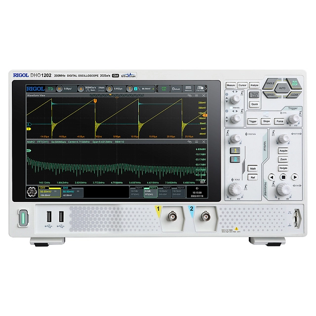 Цифровой осциллограф Rigol DHO1202 – двухканальная модель с полосой пропускания 200 МГц из серии лабораторных приборов, реализующих технологию UltraVision. Устройство оборудовано крупноразмерным дисплеем высокого разрешения и снабжено наиболее широким набором средств измерений и анализа осциллограмм среди моделей с таким же рабочим диапазоном.
