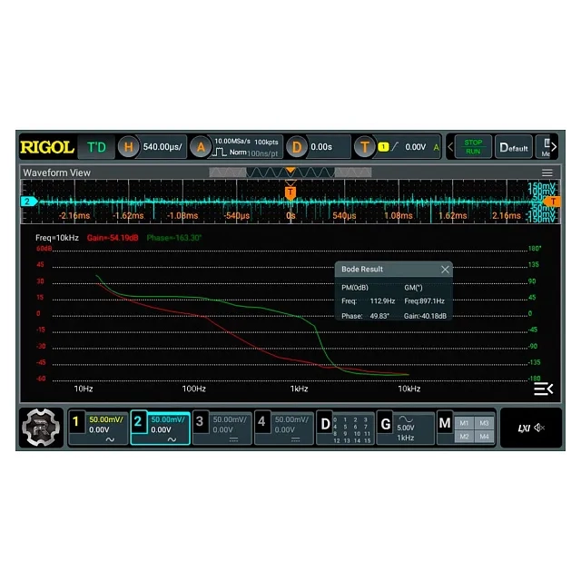 Помимо стандартных осциллографических режимов, в цифровом осциллографе реализованы функции цифрового вольтметра и прецизионного частотомера, а также логического анализатора наиболее популярных протоколов. Встроенный одноканальный генератор на основе 14-битного ЦАП с частотным диапазоном до 25 МГц способен воспроизводить 6 стандартных функций и заданную пользователем форму, в том числе с наложением модуляции AM, FM или PM. Поддержка режима диаграммы Боде дает возможность автоматизировать исследование параметров объектов контроля, с определением их амплитудных и фазовых характеристик на разных частотах.