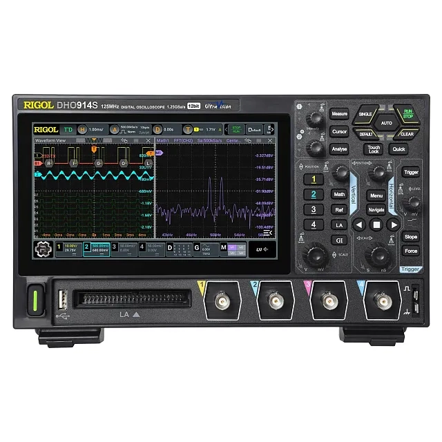 Цифровой осциллограф RIGOL DHO914S с полосой пропускания 125 МГц классифицируется производителем как лабораторное устройство базового уровня с улучшенными характеристиками, выделяясь среди приборов своего ценового диапазона от других брендов расширенными измерительными и аналитическими возможностями, а также удобством и гибкостью управления благодаря сенсорному дисплею. Компактный и легкий, он подходит как для стационарного, так и мобильного применения. Модель оснащена 4 аналоговыми каналами и 16 цифровыми входами, для задействования которых необходим опциональный логический пробник, и отличается от модификаций без индекса S наличием встроенного генератора сигналов.