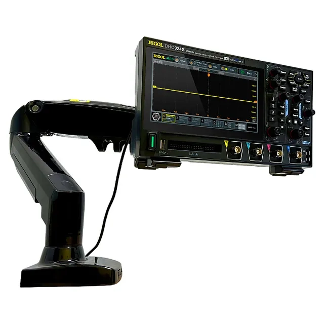 Благодаря плоской форме корпуса, толщиной меньше 8 см при сложенных ножках, осциллограф RIGOL DHO914S не загромождает рабочее место. Стандартный крепеж VESA позволяет размещать изделие с помощью соответствующего кронштейна на любой вертикальной поверхности либо фиксировать на шарнирной стойке.
