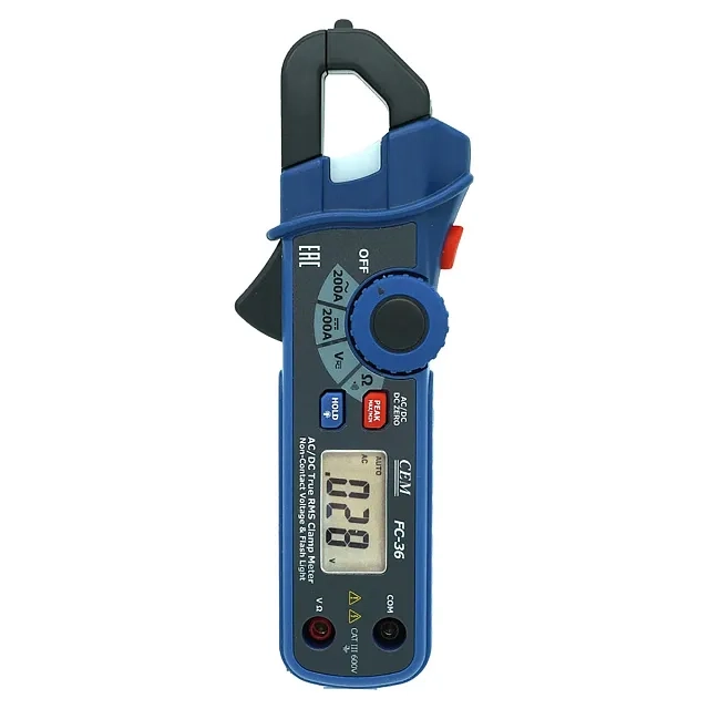 Компактные токовые клещи FC-36 предназначены для измерения постоянного и переменного тока до 200 А. Также клещи имеют бесконтактный детектор напряжения и фонарик.