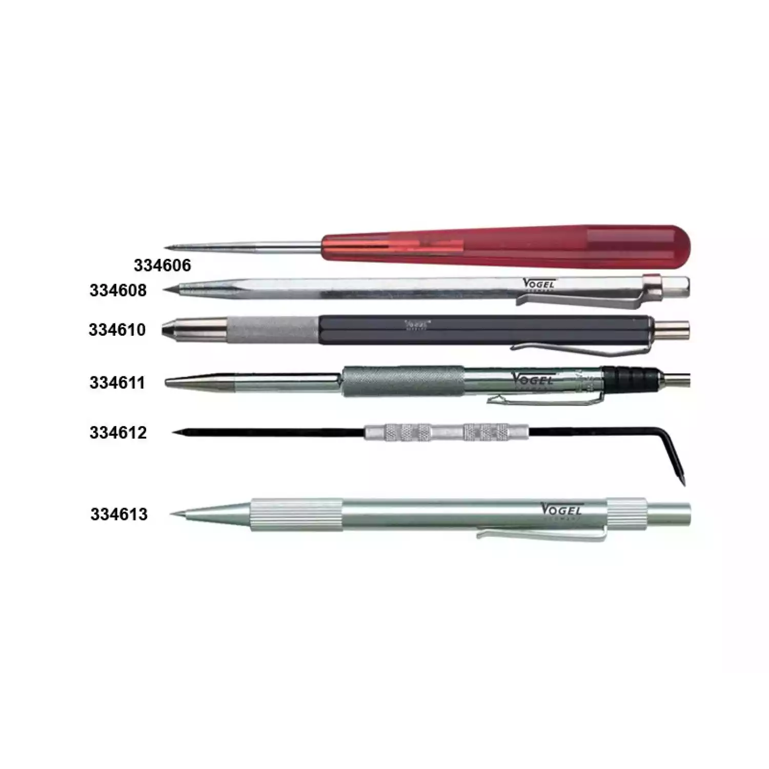 Чертилки Vogel с твердосплавными иглами, используются практически во всех отраслях промышленности, в любительских мастерских, автосалонах для нанесения разметки (рисок) на поверхность металлических заготовок и изделий. Иногда в качестве вспомогательных приспособлений используются угольники, линейки, шаблоны. Изготовлены их высококачественных материалов, устойчивых к воздействиям неблагоприятных факторов (к примеру, тепла, химических веществ). Обычно выбор типа чертилки зависит от материала, на который будет наноситься разметка: стальные выбираются для грубых деталей и заготовок, прошедших предварительную обработку; для работы с отшлифованной поверхностью уже готовых деталей рекомендуется использовать чертилки из мягких материалов, например, латуни. Не стоит пренебрегать остротой заточки инструмента: разметочная линия будет тоньше и, соответственно, точнее, если чертилка будет хорошо заточена.
