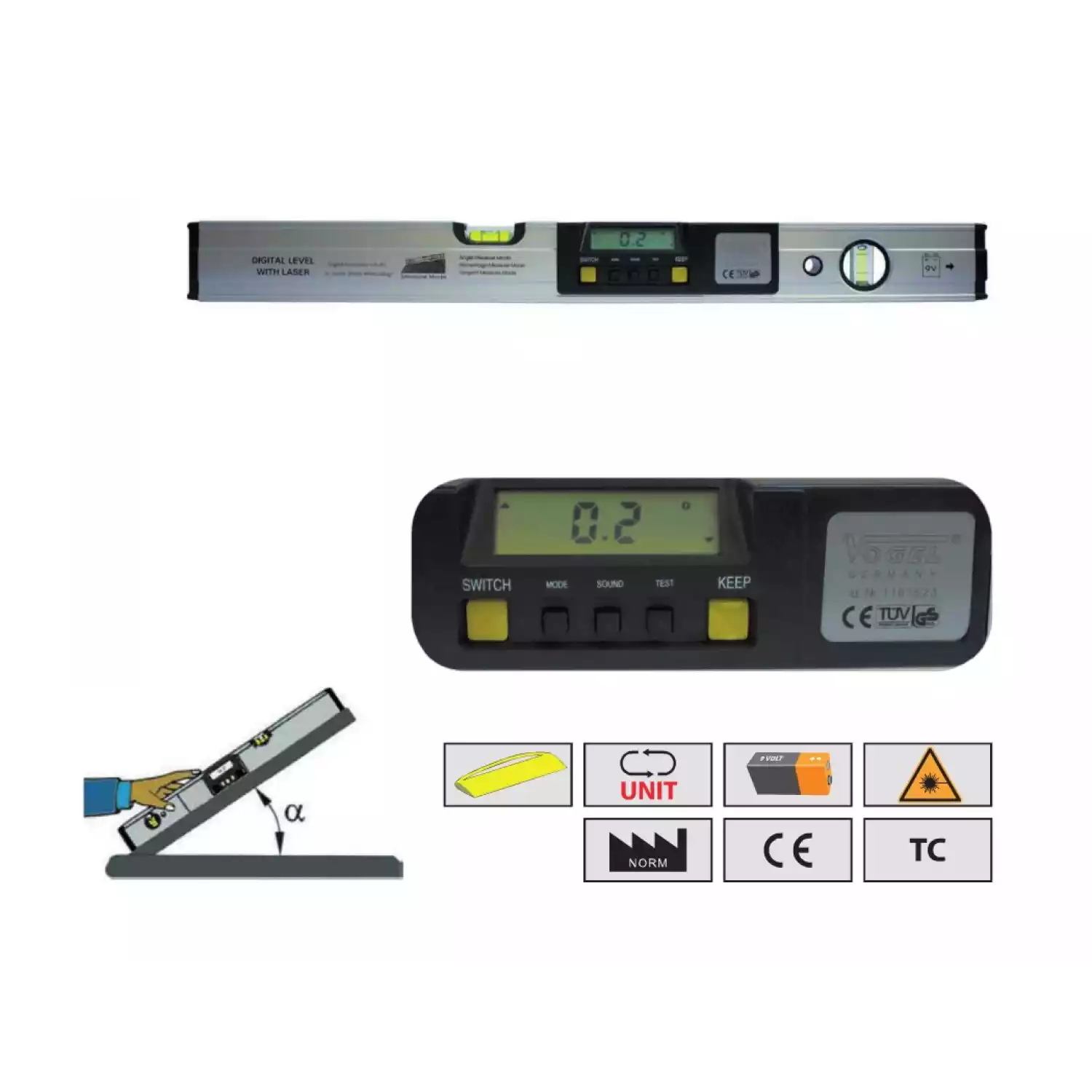 Уровни Vogel цифровые строительные, длина 600 мм, цена деления 0,1º, точность 0,029º=0,5мм, предназначены для измерения степени отклонения поверхностей от горизонтальной плоскости и для оценки соответствия определенной поверхности вертикальной или же горизонтальной плоскости. Уровень обязательно используется, когда необходима разметка перед нанесением штукатурки или других отделочных материалов, при строительстве различных конструкций, а также в ходе контрольно-измерительных работ.