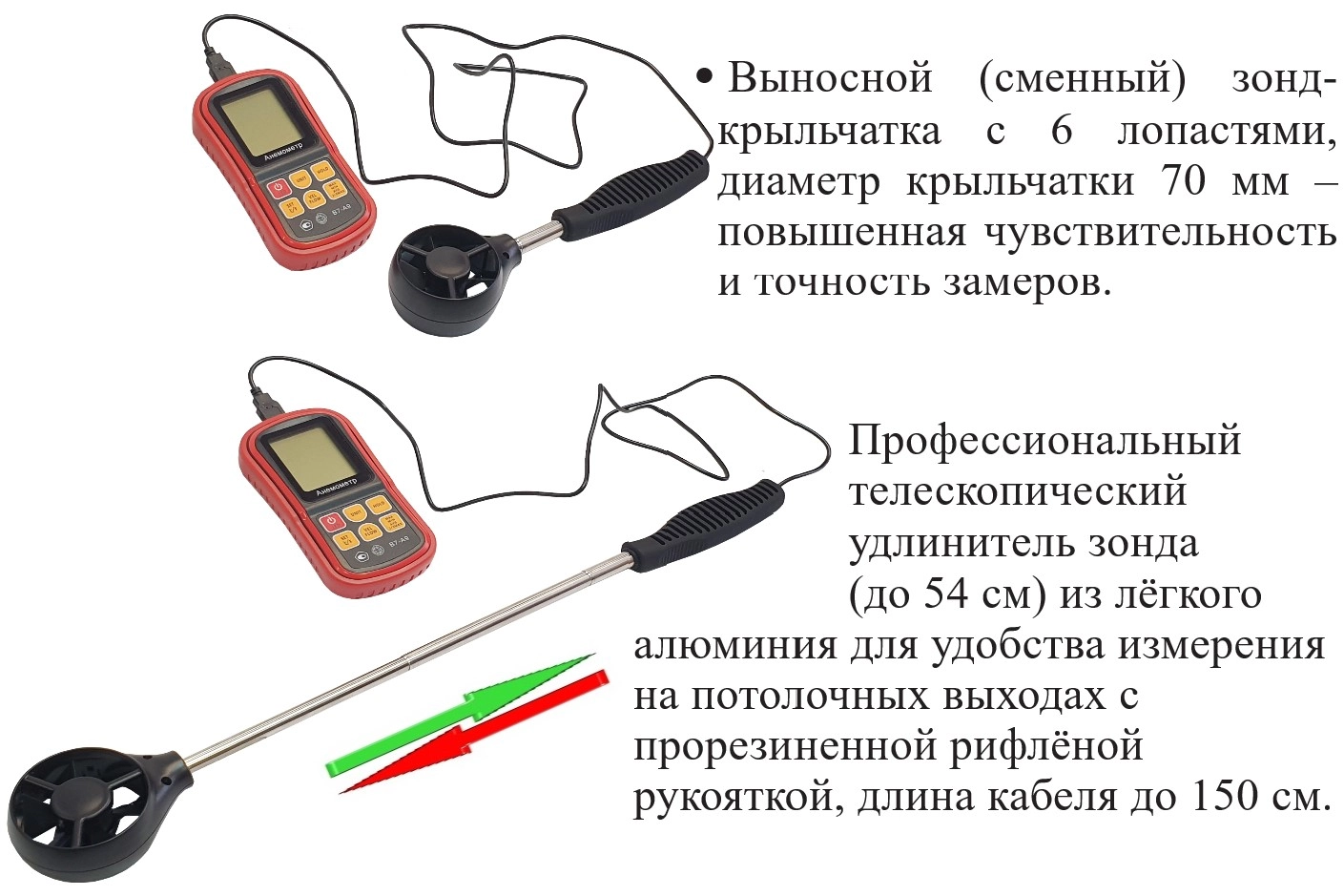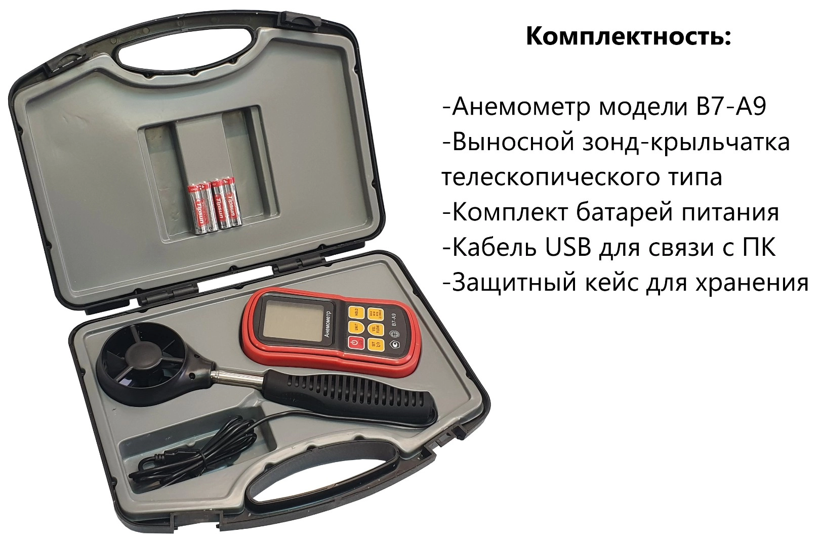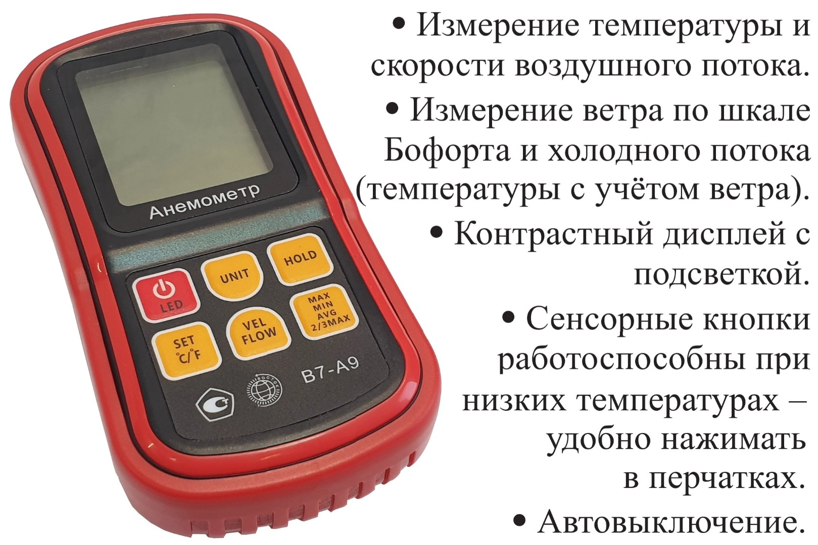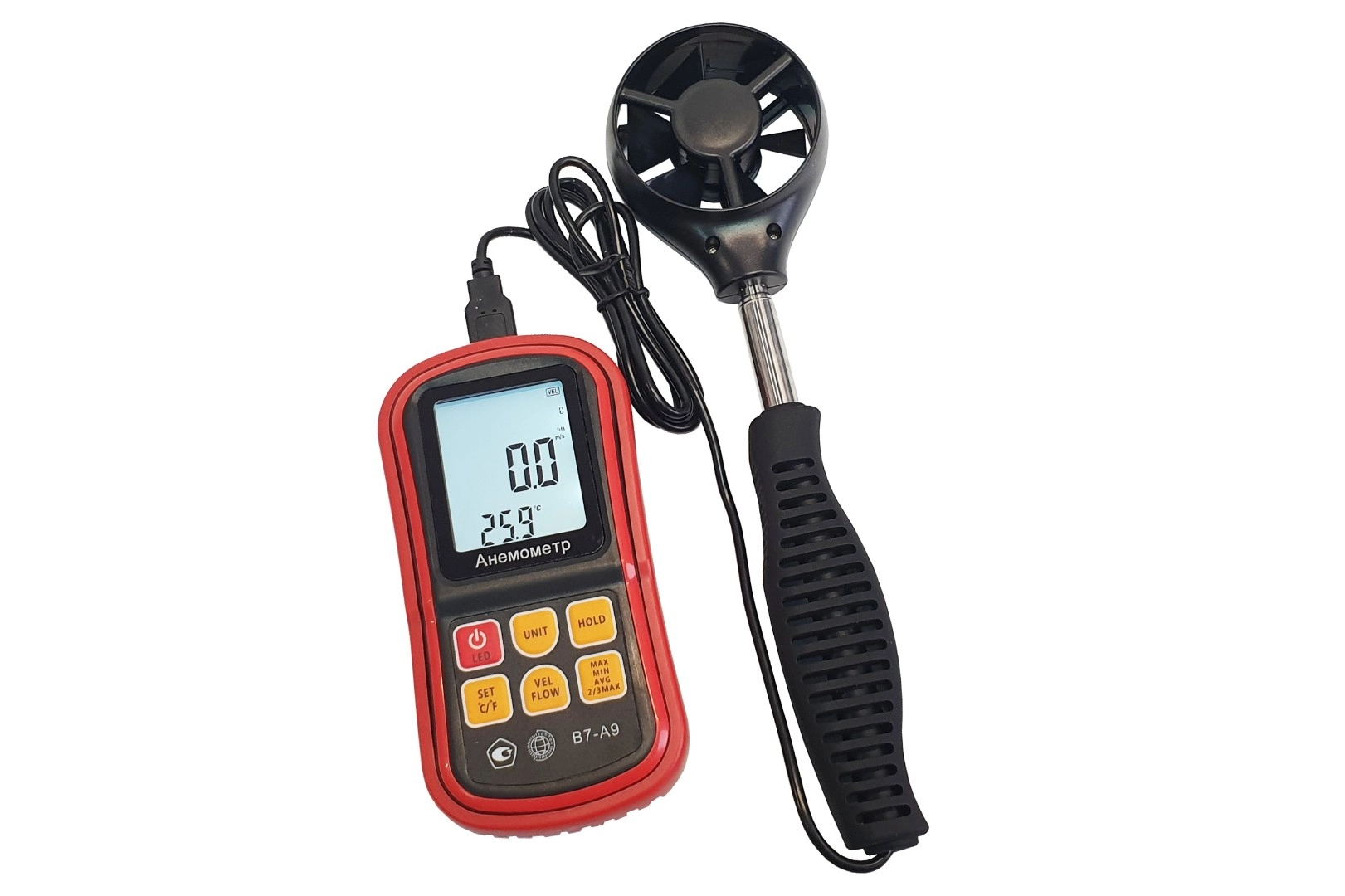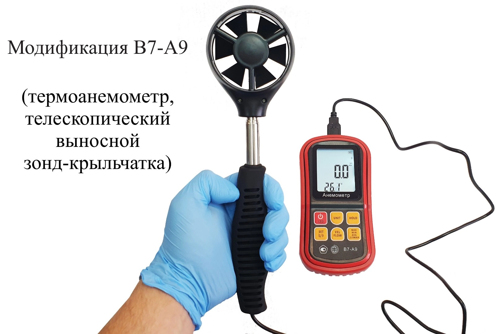 Модификация В7-А9 (термоанемометр, телескопический выносной зонд-крыльчатка) представляет собой мобильный многофункциональный микропроцессорный анемометр ручного формата. Он состоит из электронного блока с измерительным зондом выносного типа. Применяется для измерения температуры и скорости направленного воздушного потока и других газов в вентиляционных каналах и системах кондиционирования с вычислением объёма расхода, средних, максимальных и минимальных параметров воздушного потока.