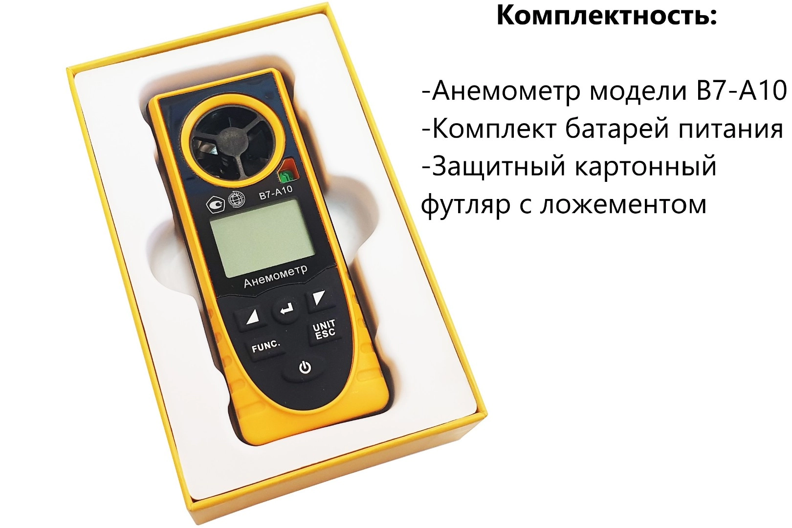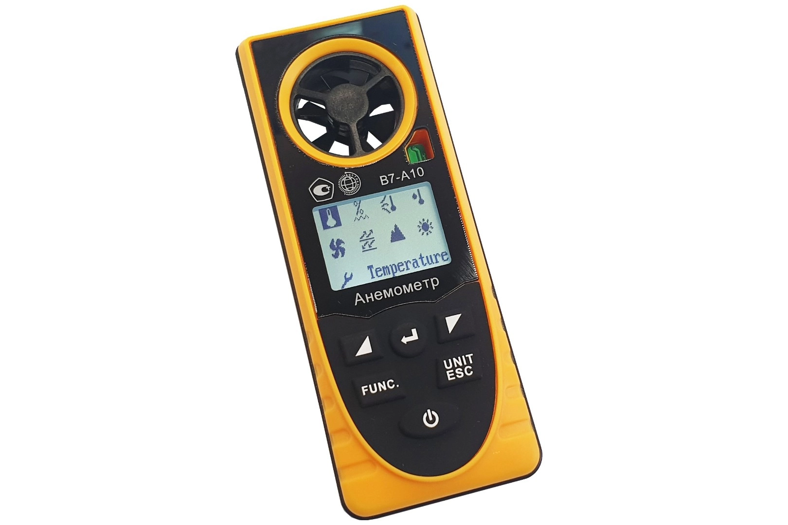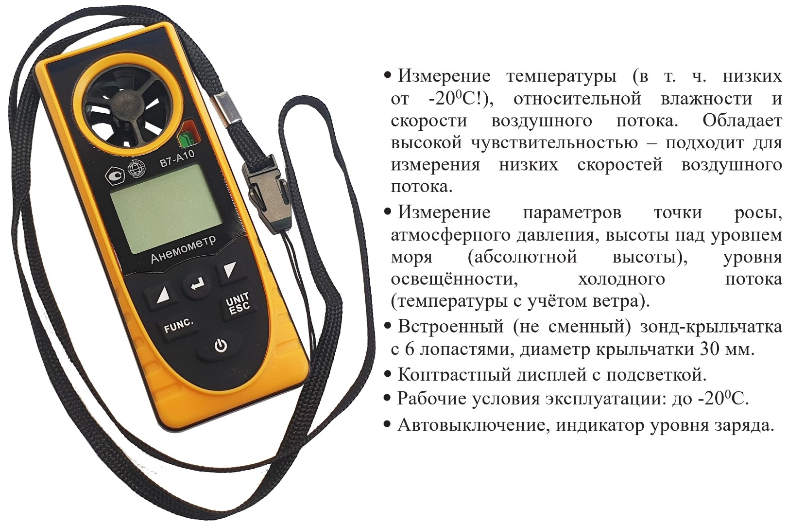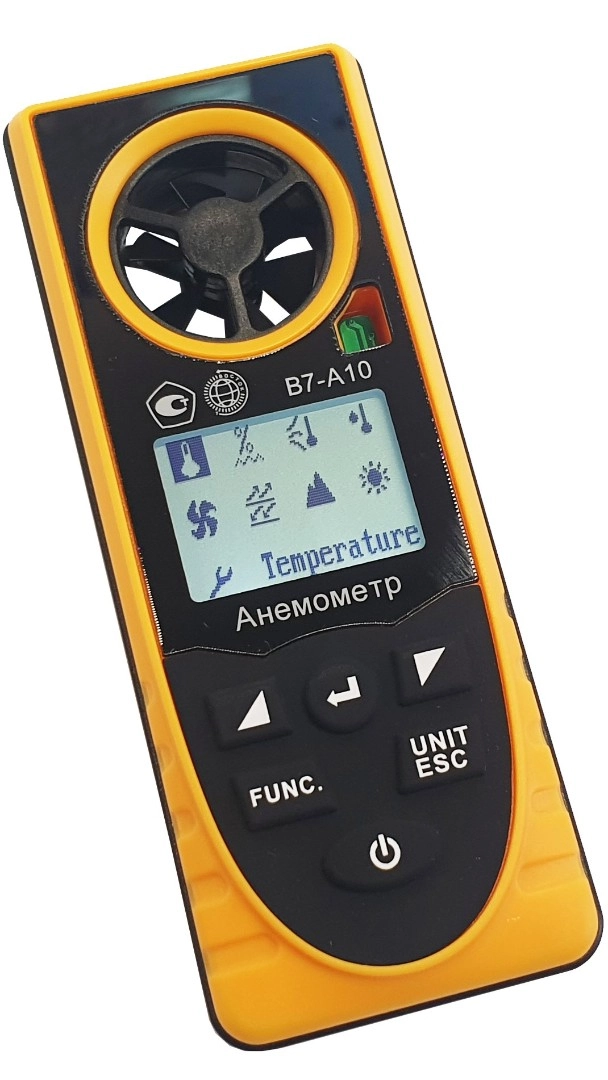 Модификация В7-А10 (термоанемометр + гигрометр, встроенный зонд-крыльчатка, каналы индикации точки росы, атмосферного давления, абсолютной высоты, уровня освещённости, холодного потока) представляет собой мобильный многофункциональный микропроцессорный анемометр ручного формата. Он состоит из электронного блока, совмещённого с измерительным зондом – моноблочного типа. Применяется для измерения температуры, относительной влажности, точки росы, атмосферного давления, высоты над уровнем моря (абсолютной высоты), уровня освещённости и скорости направленного воздушного потока и других газов в вентиляционных каналах и системах кондиционирования с вычислением объёма расхода, средних, максимальных и минимальных параметров воздушного потока.