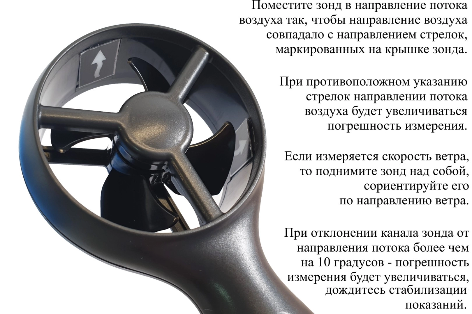 Анемометры с зондом-крыльчаткой применяются для измерения скорости направленного воздушного потока в трубопроводах и коробах вентиляционных устройств, для вычисления расхода вентиляционного воздуха в вентиляционных отверстиях, воздуховодах жилых и производственных зданий. Принцип действия приборов при измерении скорости воздушного потока модификаций В7-А2, В7-А2+, В7-А9 и В7-А10 основан на тахометрическом принципе, при котором частота вращения первичного преобразователя (крыльчатки) пропорциональна скорости воздушного потока, в который он помещён. Скорость вращения крыльчатки преобразуется в электрический сигнал индуктивным преобразователем.