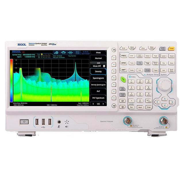 В режиме GPSA анализатор RIGOL RSA3030N позволяет исследовать спектр методом сканирования и с использованием БПФ, как в частотной, так и во временной области – при задании нулевой полосы обзора. Режим реального времени RTSA задействует оконные фильтры БПФ с установленной полосой. Поддерживается нескольких вариантов визуализации данных – в виде спектральной плотности, обычного спектра, спектрограммы и распределения мощности во временной области. Возможность их комбинирования, с выводом до трех разнотипных изображений одновременно, упрощает анализ, позволяя визуально выявлять связанные параметры.