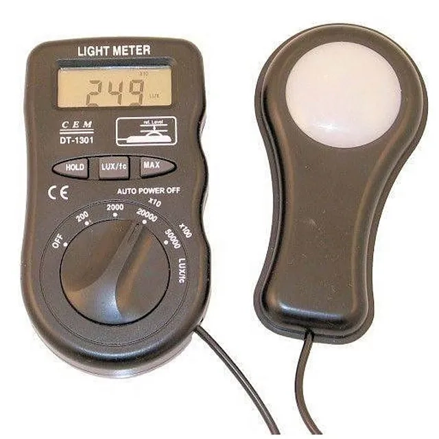 Портативный люксметр DT-1301 предназначен для быстрого и мобильного измерения уровня освещенности. С его помощью вы сможете решить множество задач, от проверки освещенности учебных заведений или производственных помещений до измерения световых характеристик теплиц или промышленных объектов. Этот люксметр имеет современный компактный и эргономичный дизайн, и состоит из самого блока с экраном и выносного фотодетектора (силиконовый фотодиод с фильтром).