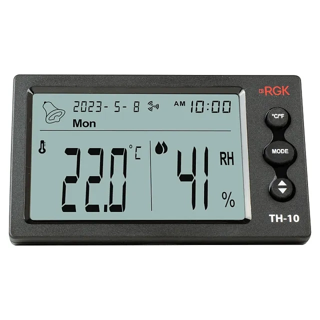 Электронный термогигрометр RGK TH-10 обновляет показания температуры и влажности раз в 10 с. Можно настроить прибор так, чтобы каждый час подавался звуковой сигнал, напоминающий о необходимости проверки климатических параметров. Отображение текущего времени и даты упрощает занесение данных в журнал и другую документацию.