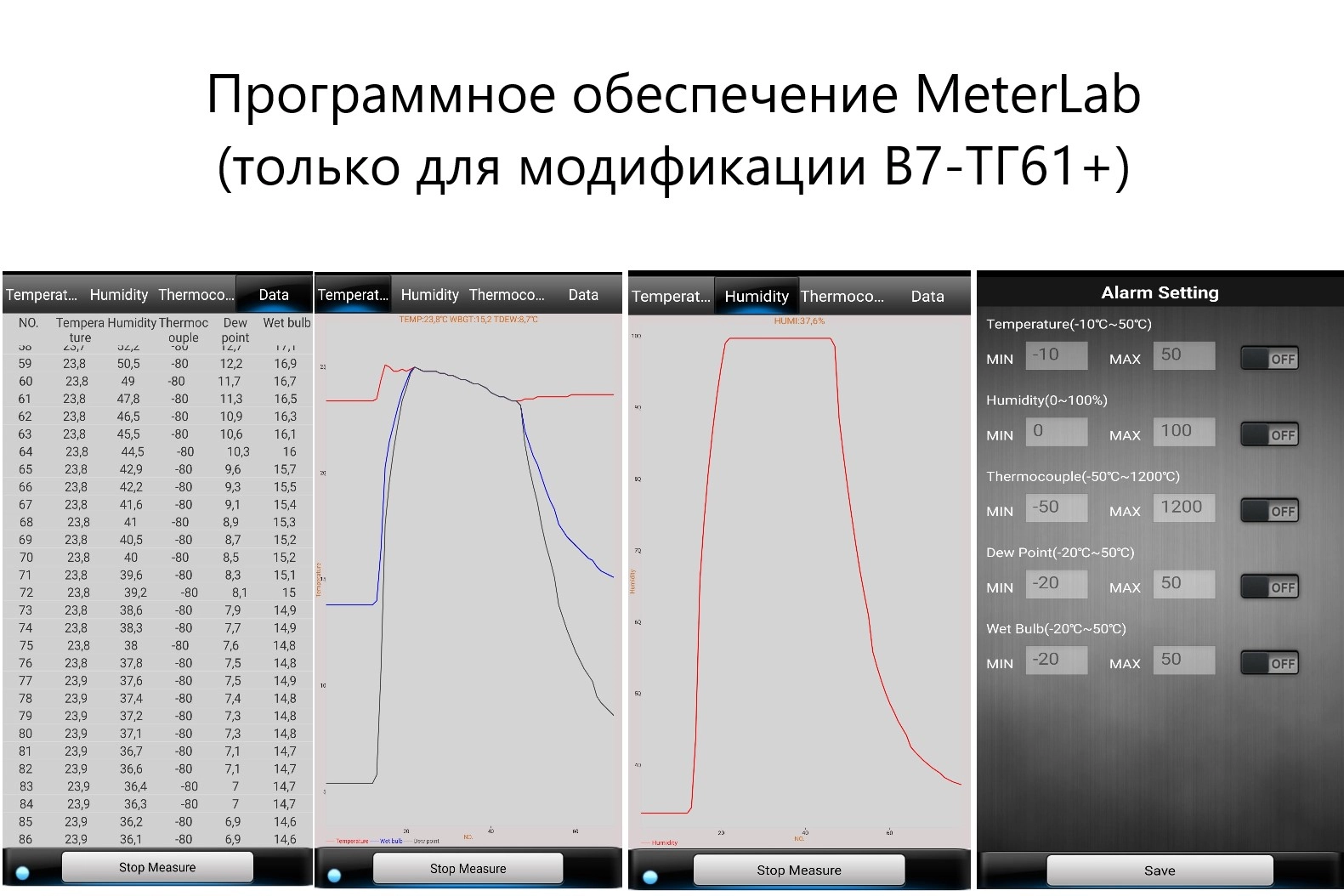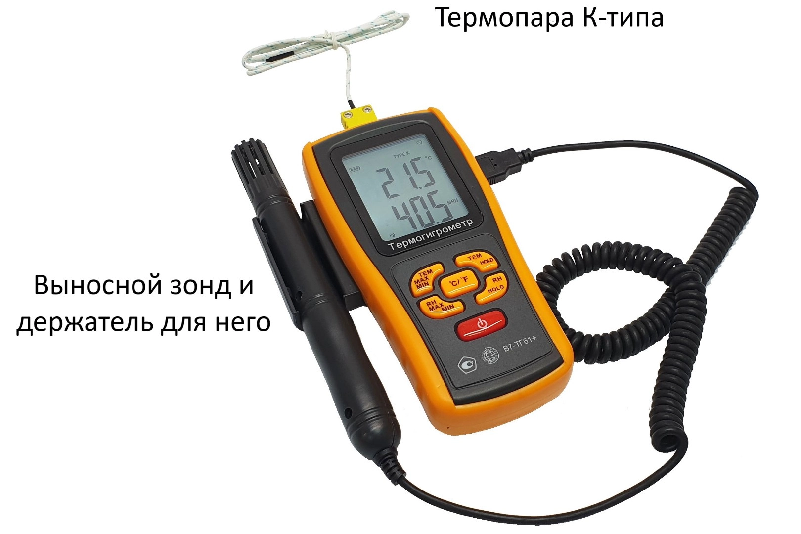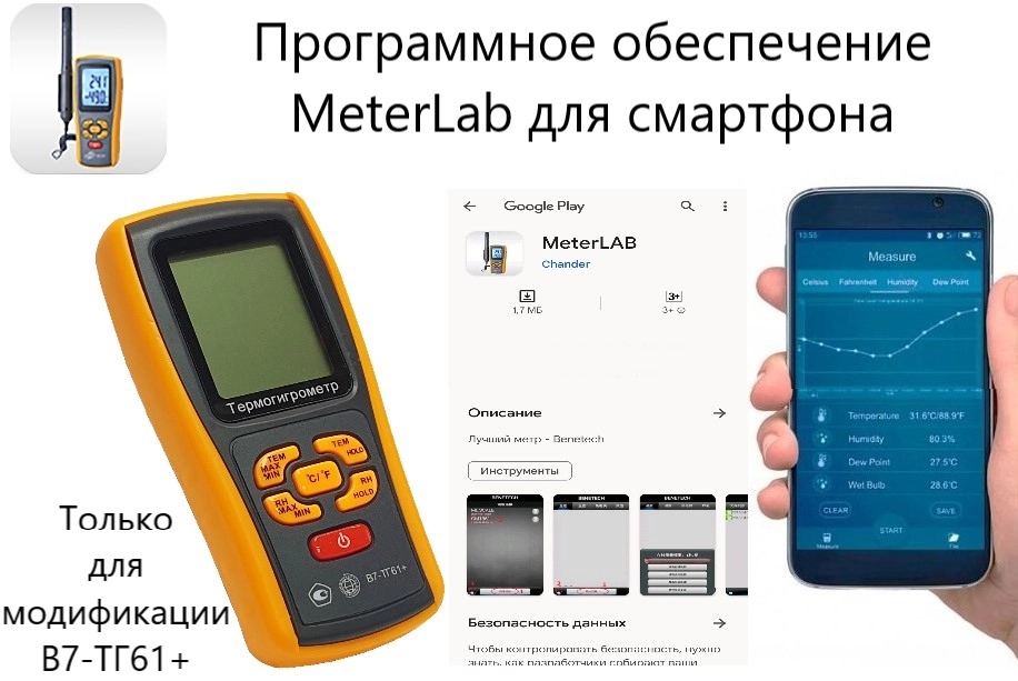 Термогигрометры портативыне модификации В7-ТГ61+ представляют собой переносные многофункциональные микропроцессорные приборы. Они состоят из электронного блока со съёмным защитным резиновым чехлом, съёмного (выносного) измерительного зонда, съёмного термоэлектрического преобразователя (ТП бес-корпусного исполнения с открытым рабочим спаем) с номинальной статической характеристикой (НСХ) преобразования типа «K» по ГОСТ Р 8.585–2001. Модификация В7-ТГ61+ оснащена Bluetooth.