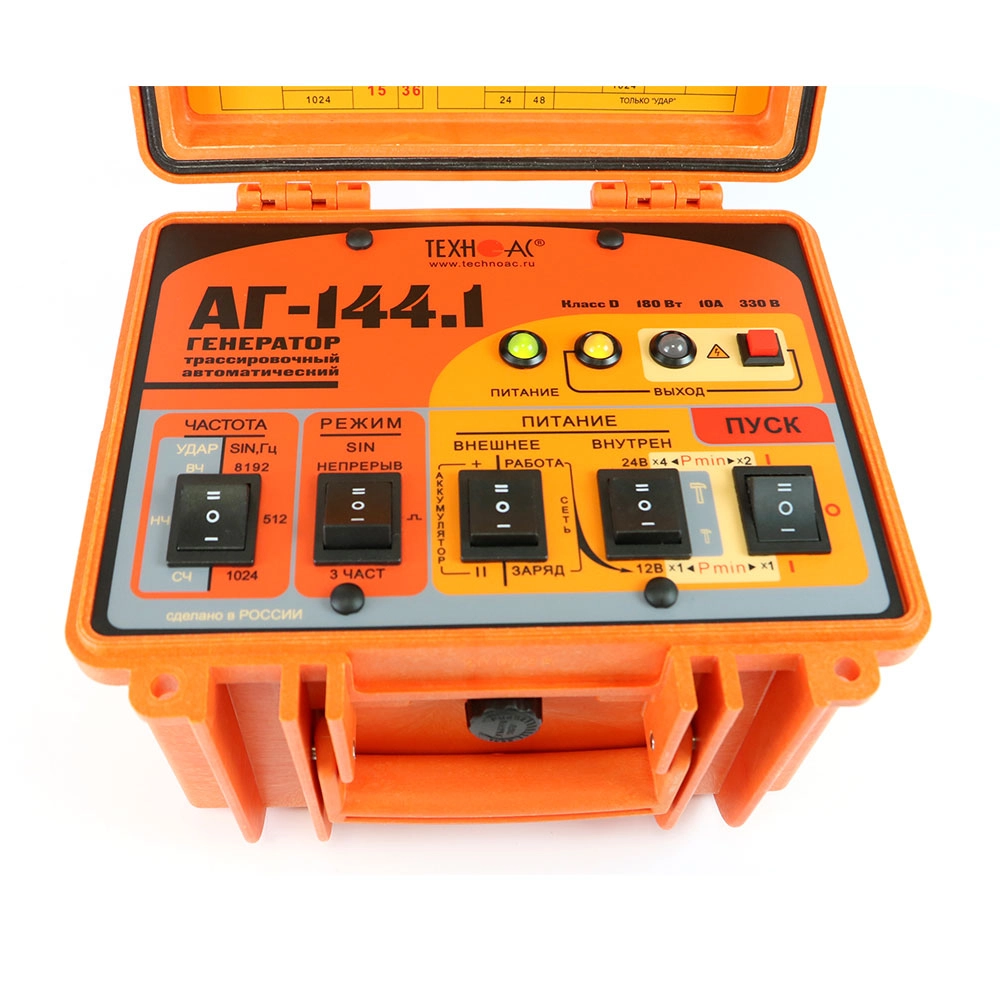 | Автоматические выключения генерации (зарядки) | - при разряде аккумуляторов ниже допустимой нормы (предотвращение глубокого необратимого разряда); - при несоответствии внешнего напряжения питания режиму генерации / зарядки; - при переключении режима сетевого питания в процессе зарядки; - при коротком замыкании выхода в процессе согласования; - при несоответствии режима генерации наличию / отсутствию передающей антенны или ударного механизма на выходе |