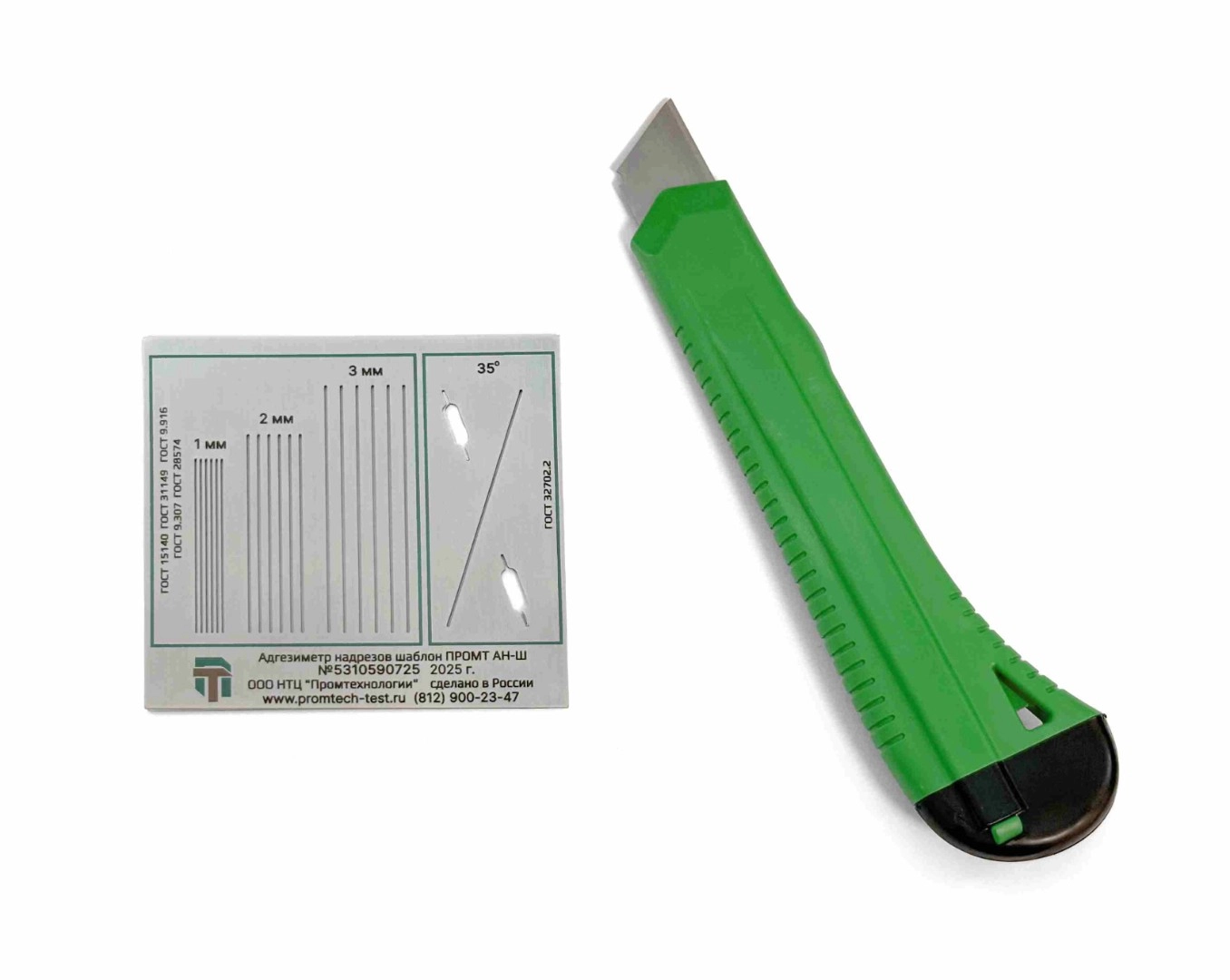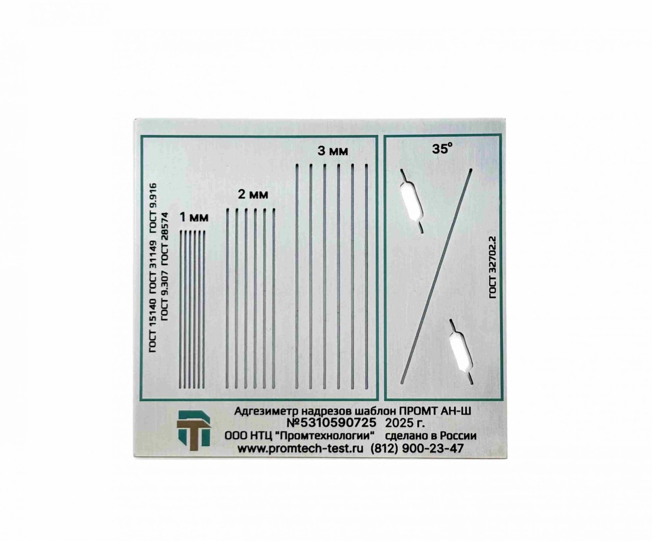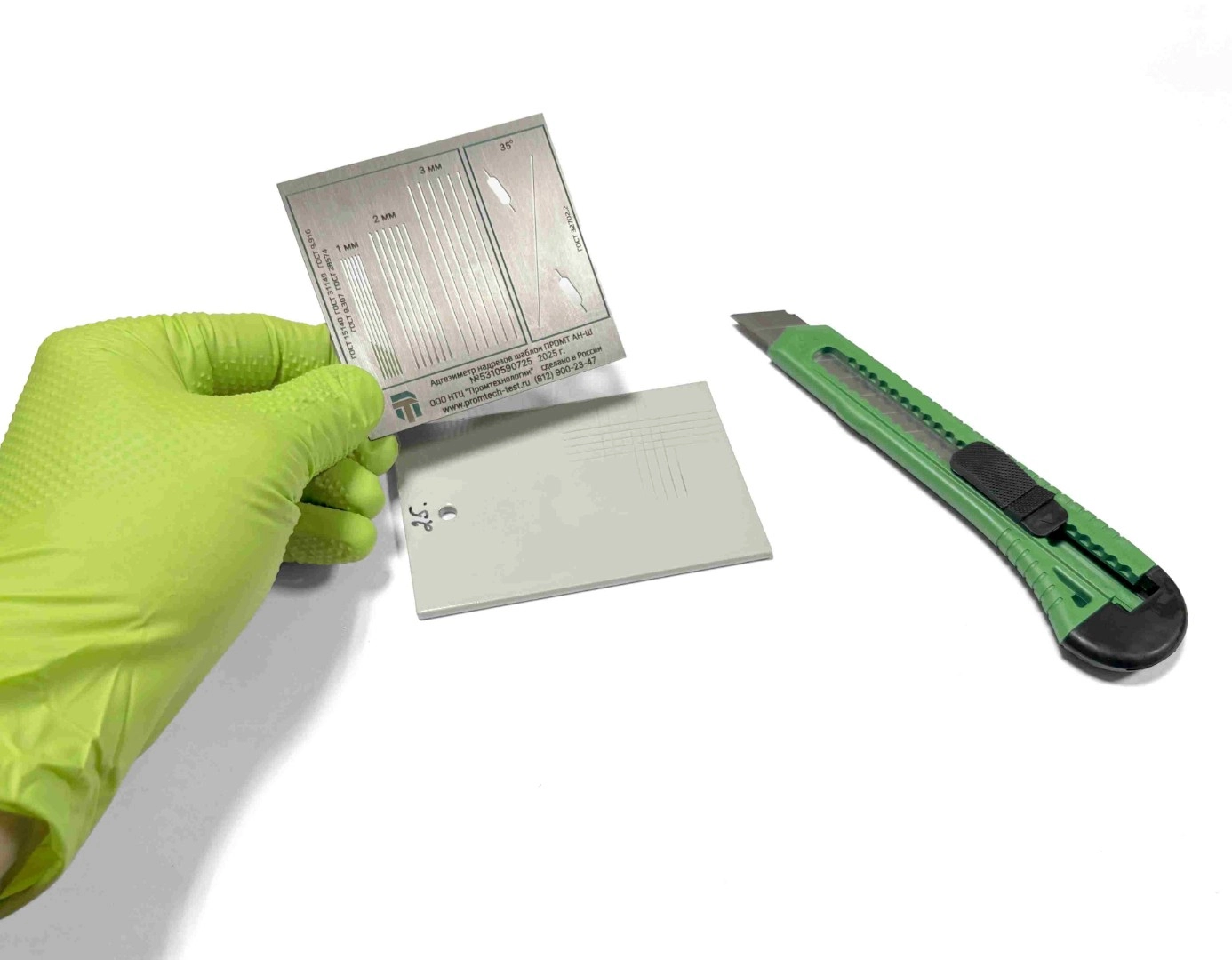 Адгезиметр надрезов шаблон ПРОМТ АН-Ш представляет из себя шаблон из нержавеющей стали, в котором изготовлены нормированные прорези: