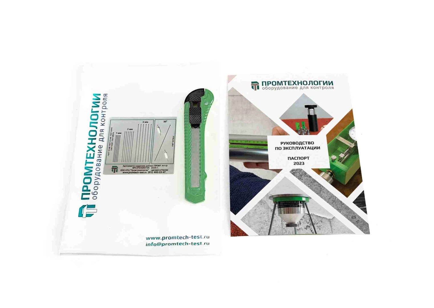 Адгезиметр надрезов шаблон ПРОМТ АН-Ш используется для контроля адгезии покрытий методом параллельных, решетчатых и Х-образного надрезов. В основу метода положено определение характера и степени разрушения покрытия после нанесения на него параллельных, решетчатых либо Х-образного надрезов. Шаг и угол надрезов выдерживается использованием одного из видов прорезей в шаблоне. Степень адгезии определяется по таблице предусмотренной используемым нормативом. Является модифицированной версией устройства NOVOTEST АР-АХ.