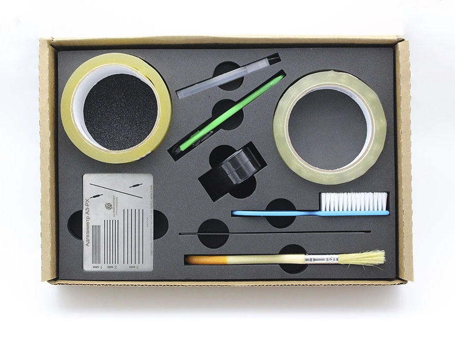 Адгезиметр выполнен в виде шаблона из нержавеющей стали с прорезями для нанесения надрезов.