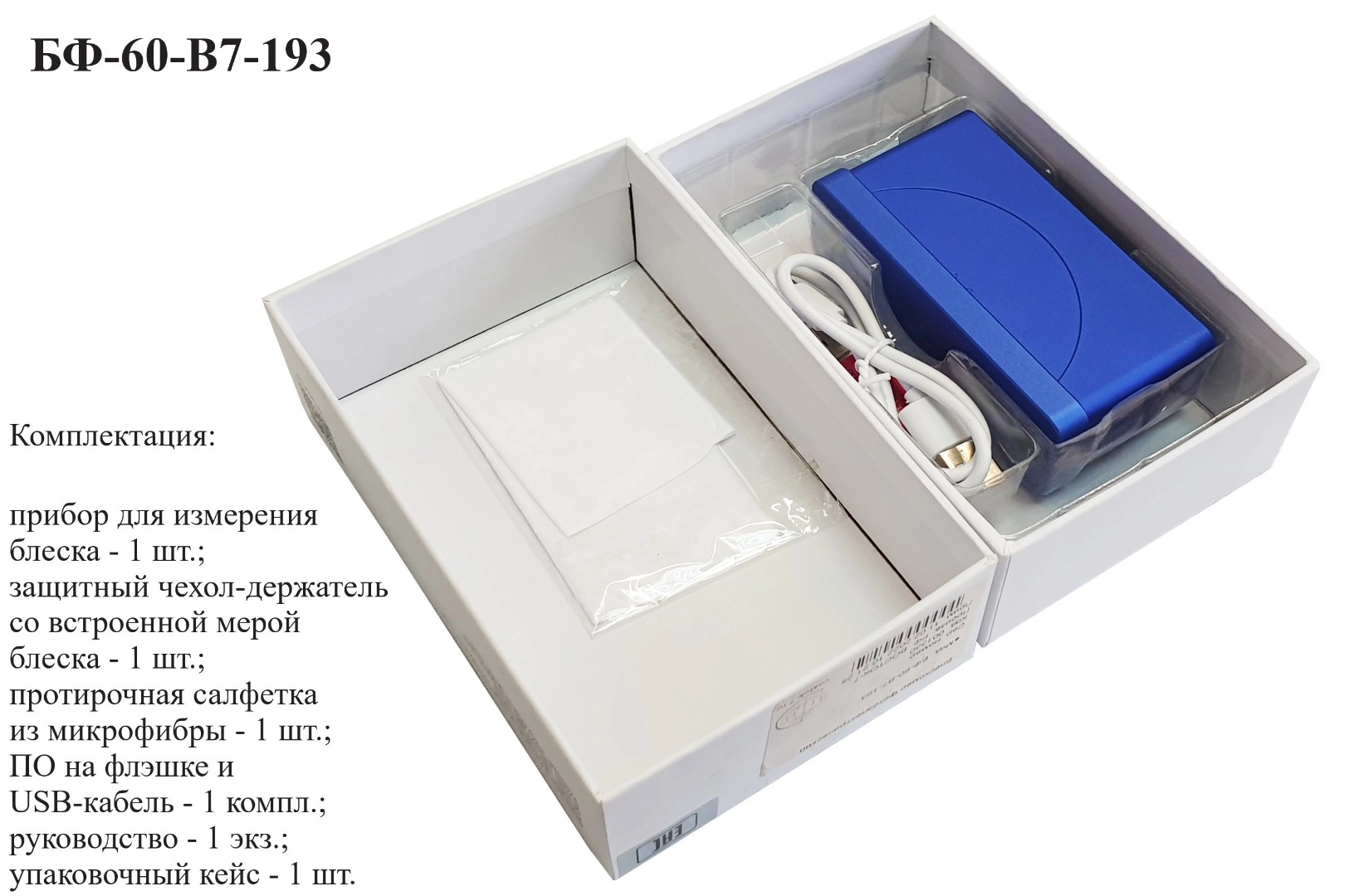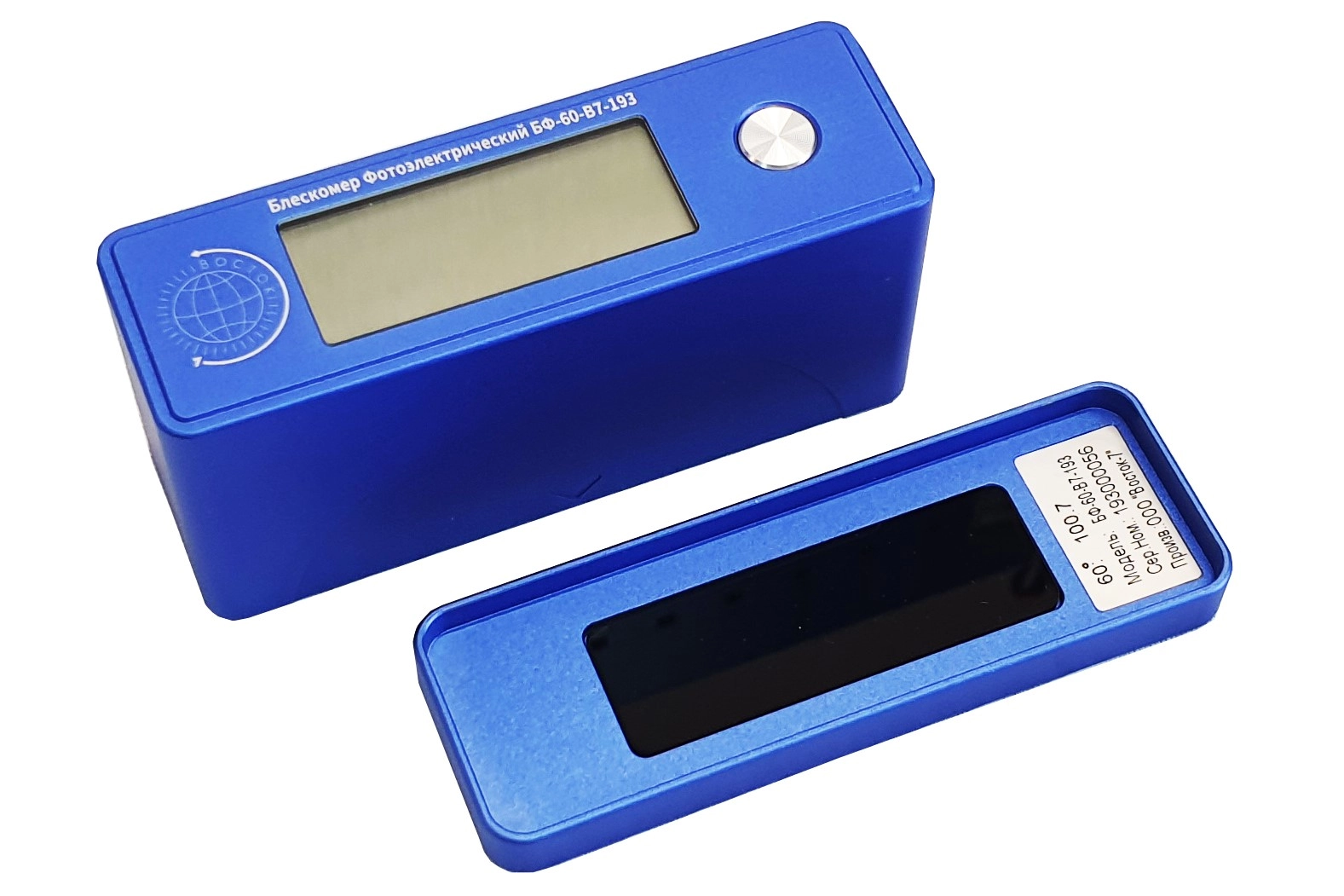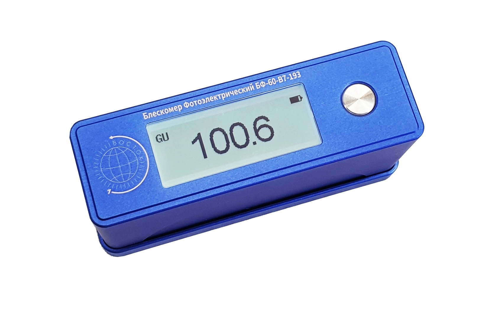 Блескомер модификации БФ-60-В7-193 предназначен для измерений блеска в геометрии освещения/наблюдения 60°/60°. Размер измеряемого участка не более 1,5х3 мм (эллипс). Встроенное программное обеспечение осуществляет калибровку показаний по установочной (настроечной) мере блеска поверхности (вмонтирована внутрь крышки защитного чехла-держателя), обеспечивает возможность передачи и работы с данными на внешнем ПК. Результаты измерений, а также заданные режимы работы выводятся на жидкокристаллический дисплей 47х19 мм.