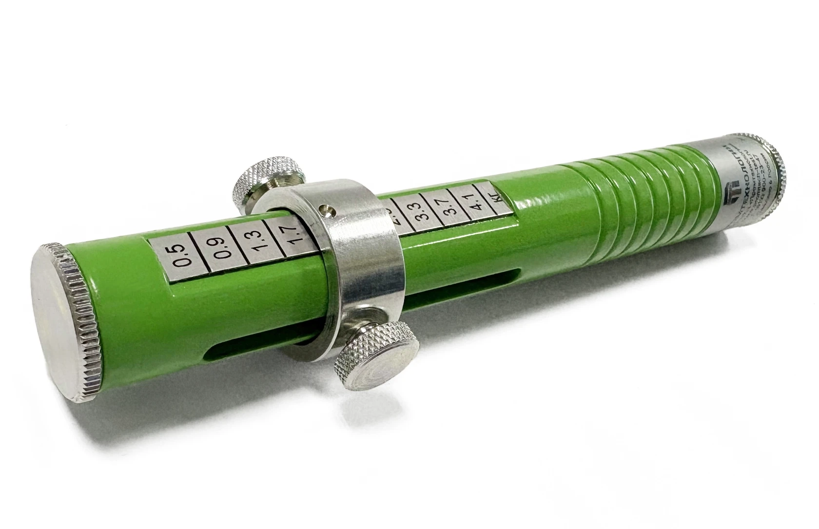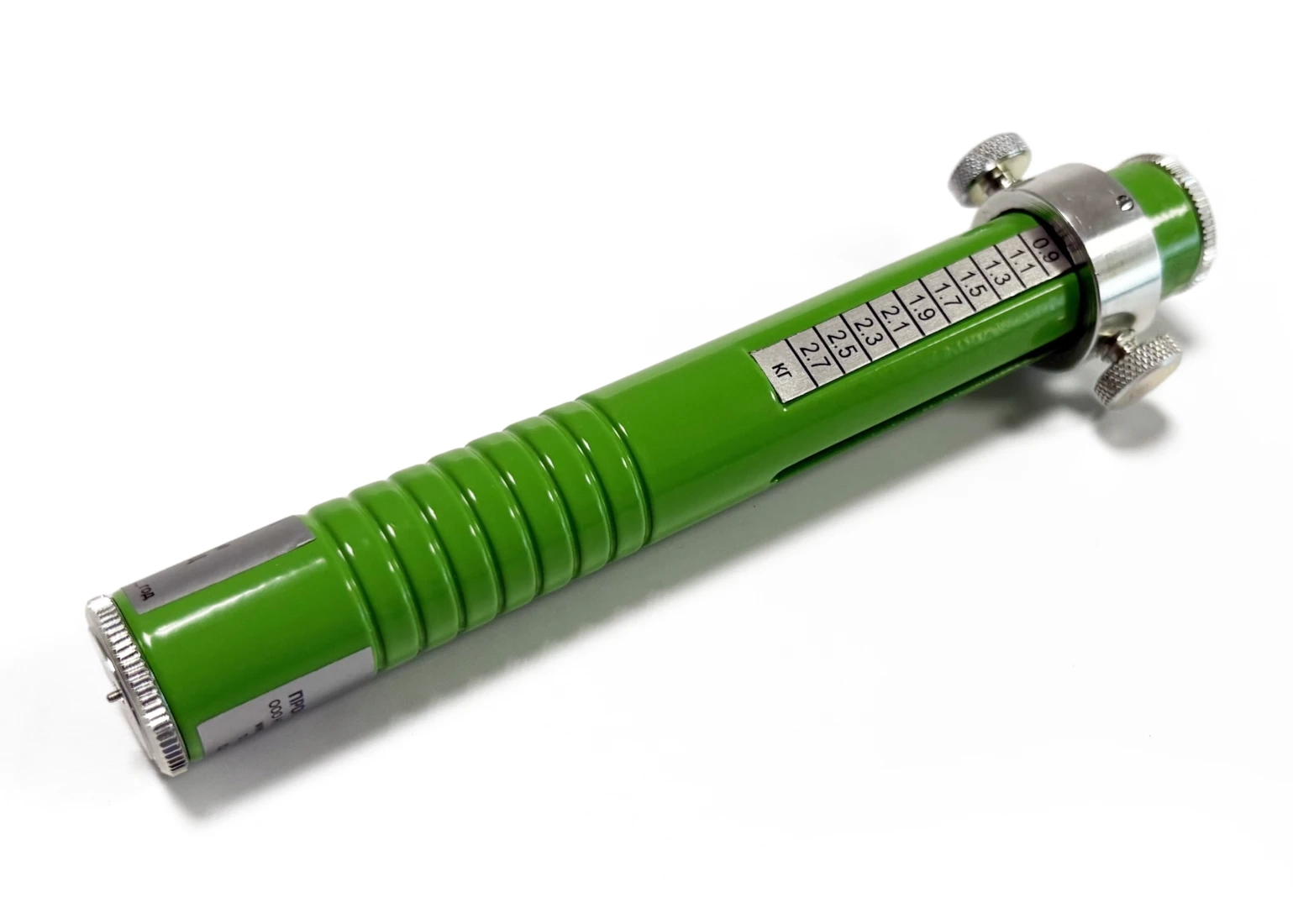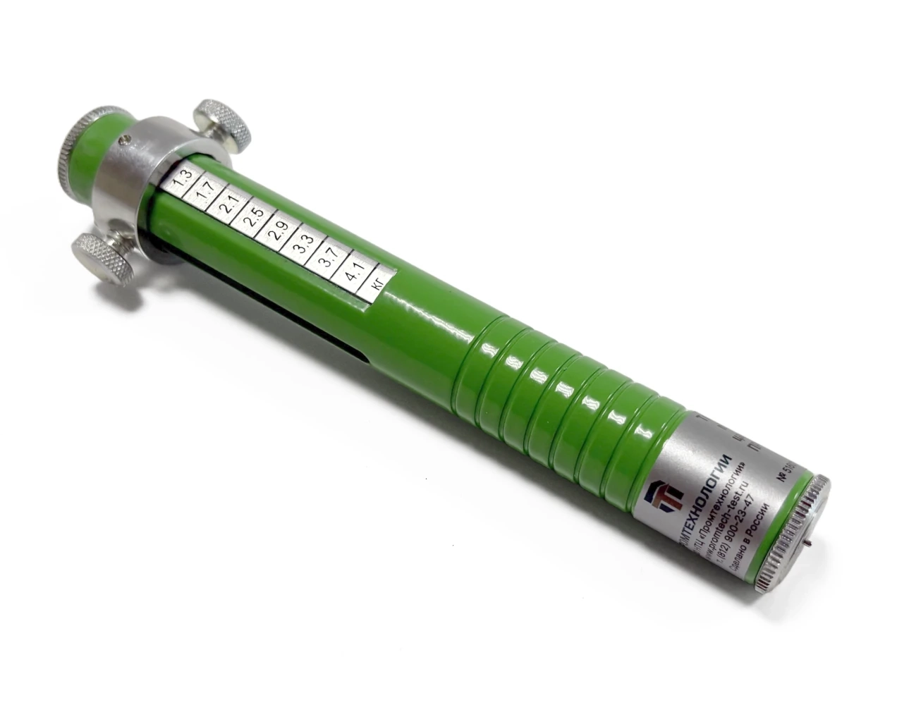 Твердомер изготавливается из металла и представляет из себя цилиндрический корпус со встроенным индентором и тарированной пружиной. Индентор игольчатого типа из закаленной стали со сферическим наконечником диаметром 1 мм. На индентор воздействует одна из 2-х сменных пружин нагрузка которых регулируется ползунком с зажимом снаружи прибора. Величина нагрузки определяется по одной из 2-х шкал расположенных на боковых гранях прибора в пределах от 0 до 4 кг. Устройство является испытательным оборудованием и не подлежит внесению в ГОСРЕЕСТР СИ РФ.