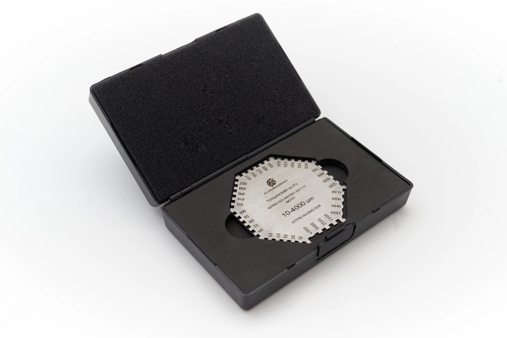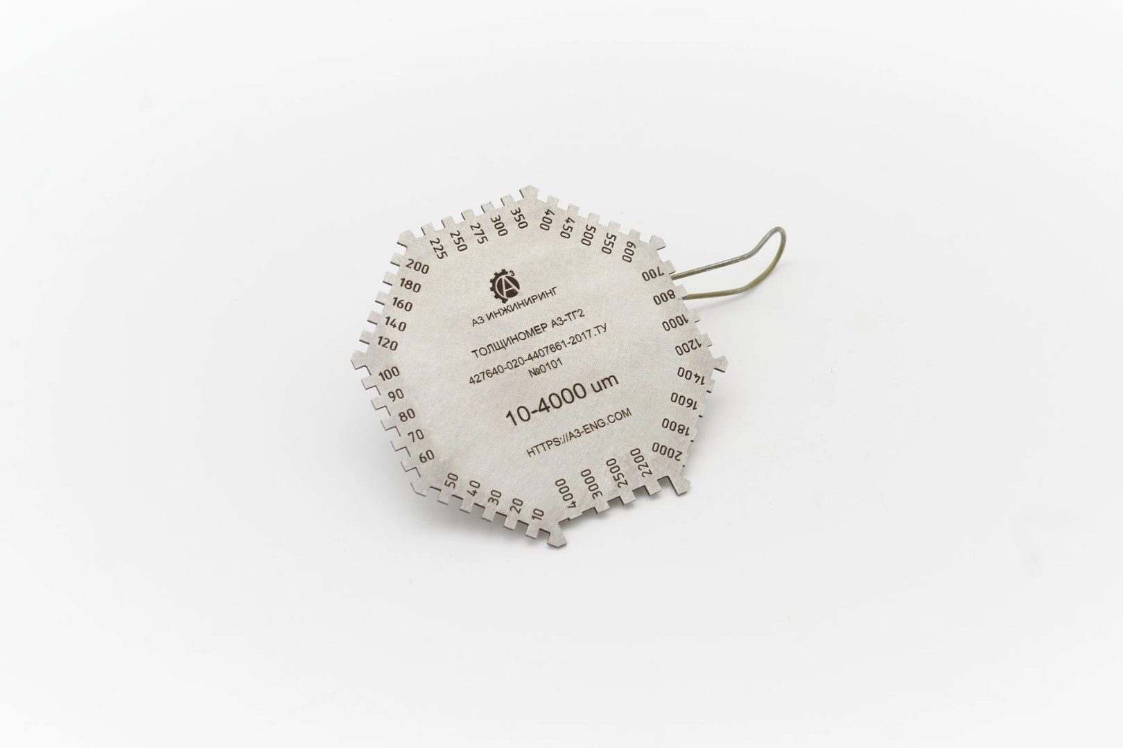 Гексагональная гребенка А3-ТГ2 представляет собой шаблон-многоугольник из листовой нержавеющей стали для измерения толщины неотвердевших лакокрасочных покрытий на плоских и цилиндрических изделиях в диапазоне от 0 до 4000 мкм. На сторонах шаблона имеются две опорные базы и набор выступов с фиксированным зазором относительно баз. Величина зазора отмечена на соответствующем выступе.
