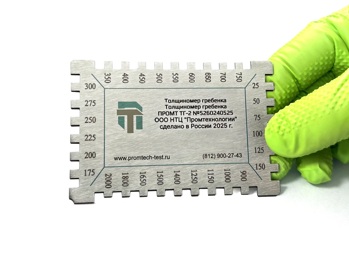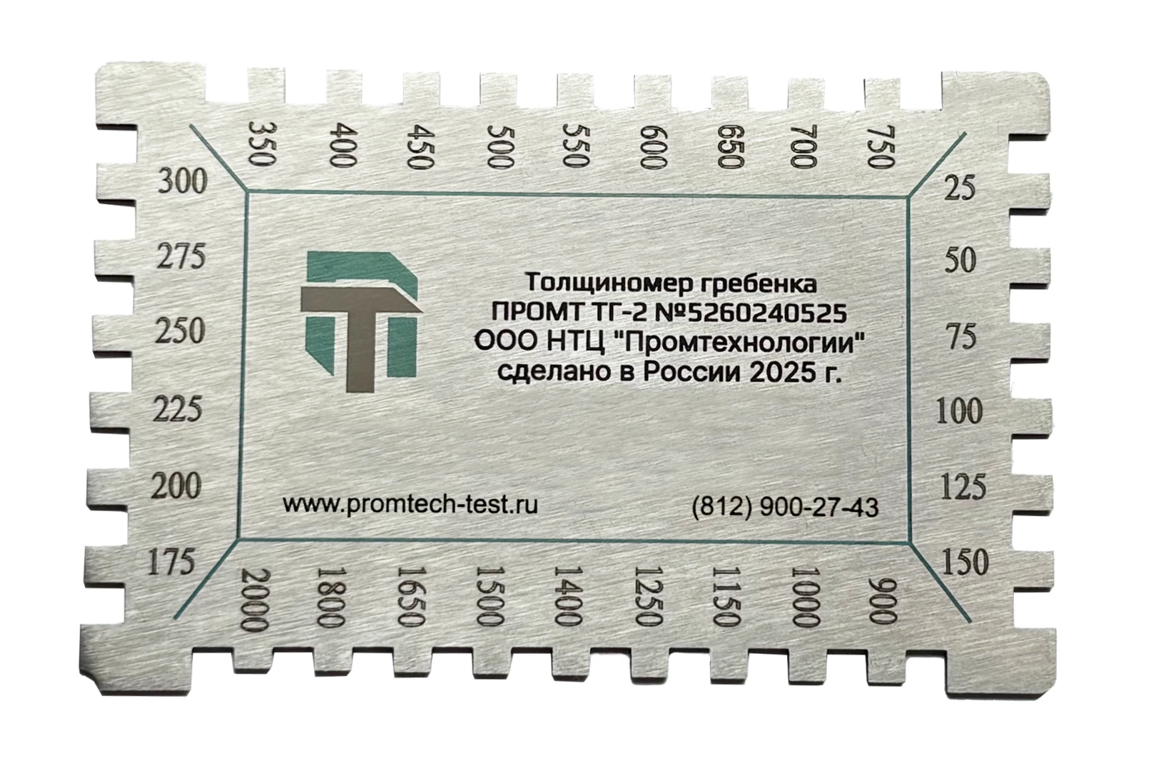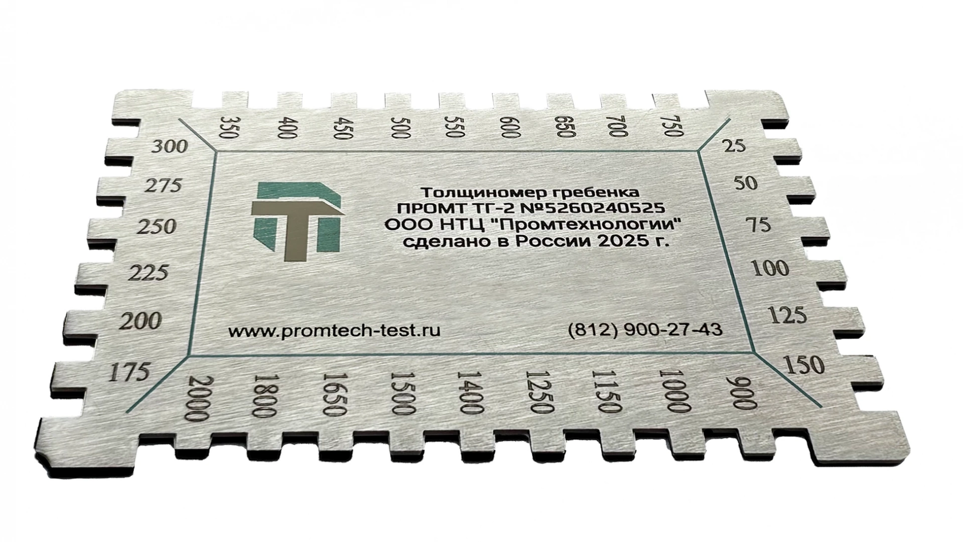 Толщиномер-гребенка ПРОМТ ТГ-2 – наиболее простой и надежный прибор для измерения толщины мокрого слоя лакокрасочного покрытия. Толщиномер представляет собой четырехугольную металлическую пластину. Каждая из граней прибора имеет по две опорные базы, между которыми расположены зубья различной длинны, над каждым из них имеется гравировка со значением расстояния от края зуба до оси между опорными базами.