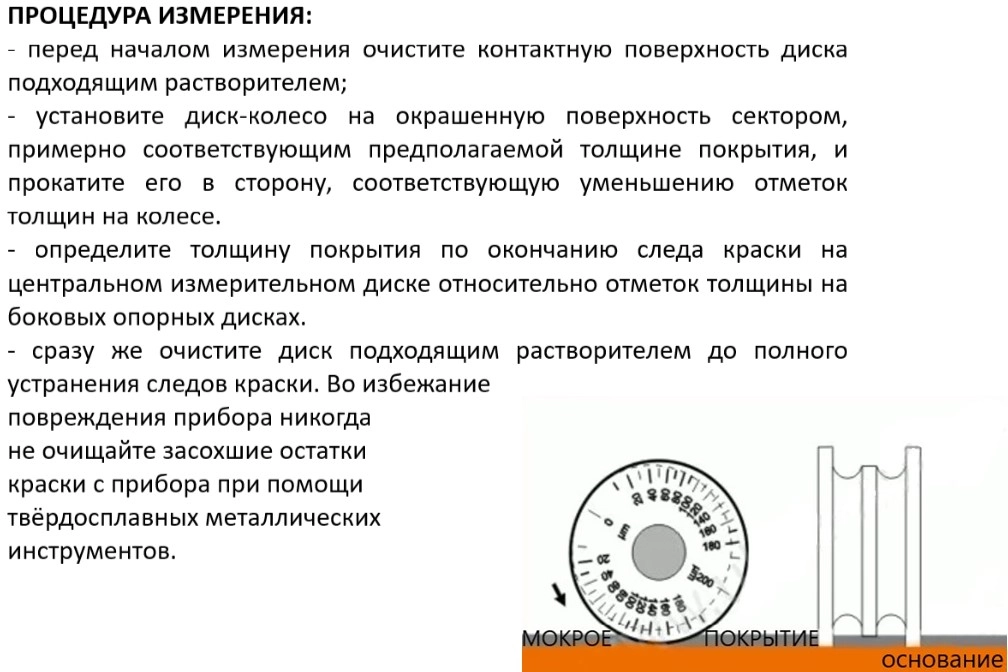 Диск-колесо представляет собой высокоточный и лёгкий в использовании прибор, предназначенный для оперативного измерения толщин влажных не отвердевших лакокрасочных покрытий на плоских и цилиндрических изделиях с целью оценки окончательной толщины покрытия после его полимеризации. Диски для измерения мокрого слоя соответствуют требованиям ISO 2808:2007; ASTM D1212 и D4414. Толщиномеры изготовлены из высококачественной нержавеющей стали, которая легко очищается растворителем, практически не повреждается и служит в разы дольше дешёвых толщиномеров-дисков из алюминия.