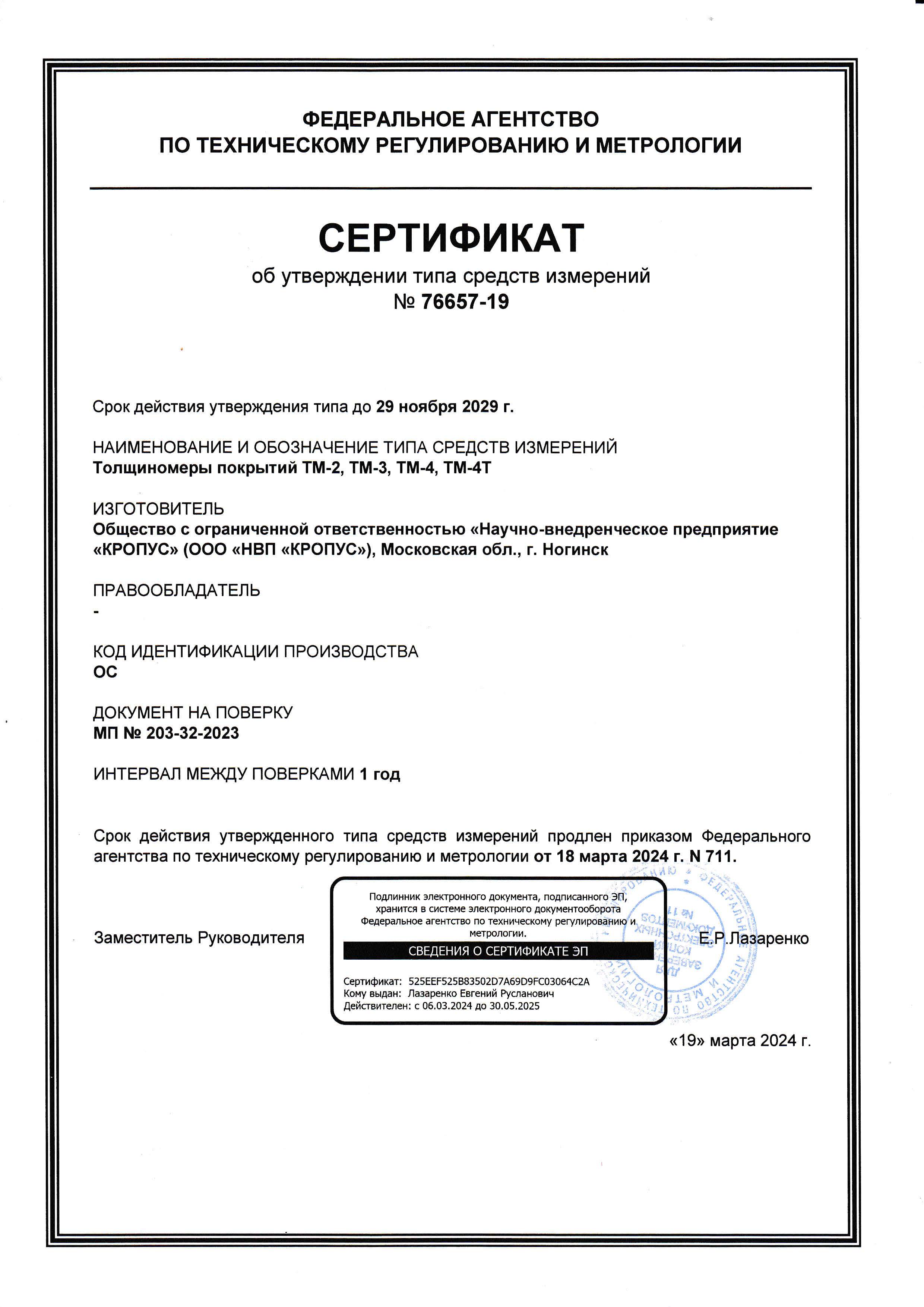 Толщиномер покрытий аттестован в Госстандарте России (сертификат RU.C.27.003.A № 16287 ), зарегистрирован в Государственном реестре средств измерений под №25868-03 и допущен к применению в Российской Федерации.