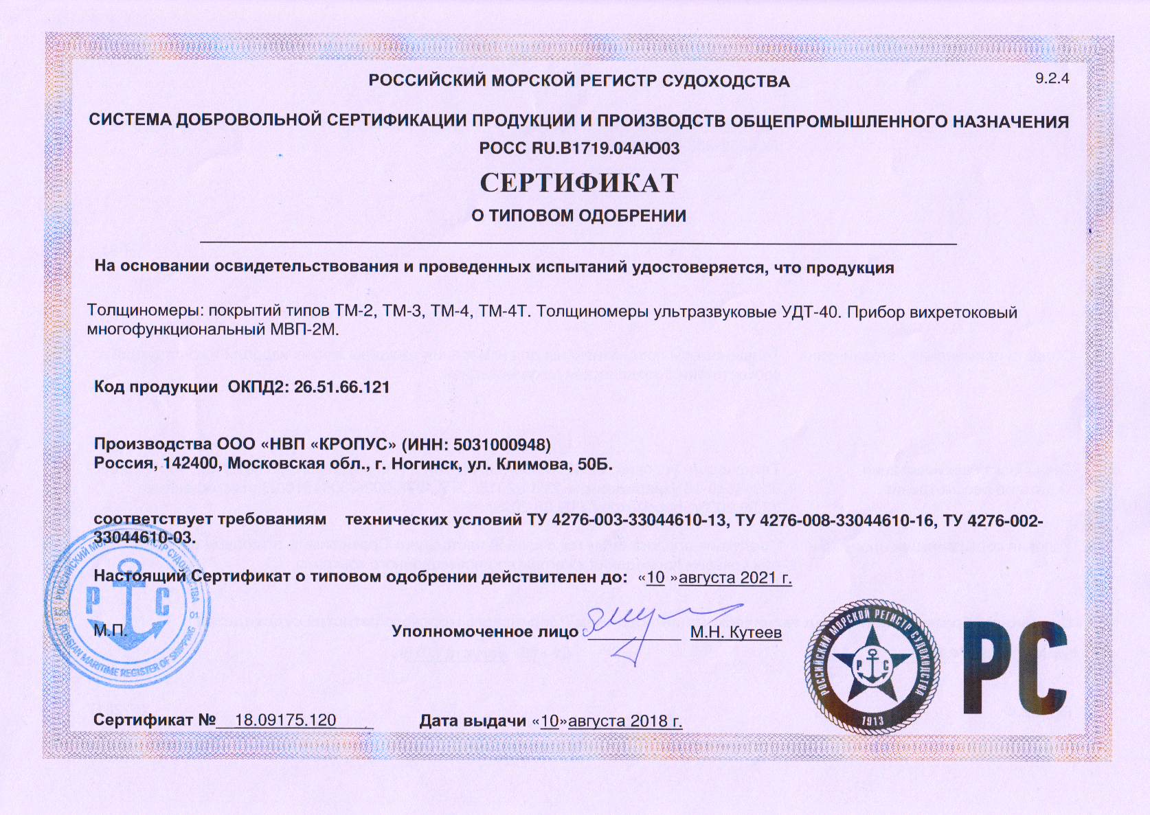 Толщиномер покрытий аттестован в Госстандарте России (сертификат RU.C.27.003.A № 16287 ), зарегистрирован в Государственном реестре средств измерений под №25868-03 и допущен к применению в Российской Федерации.