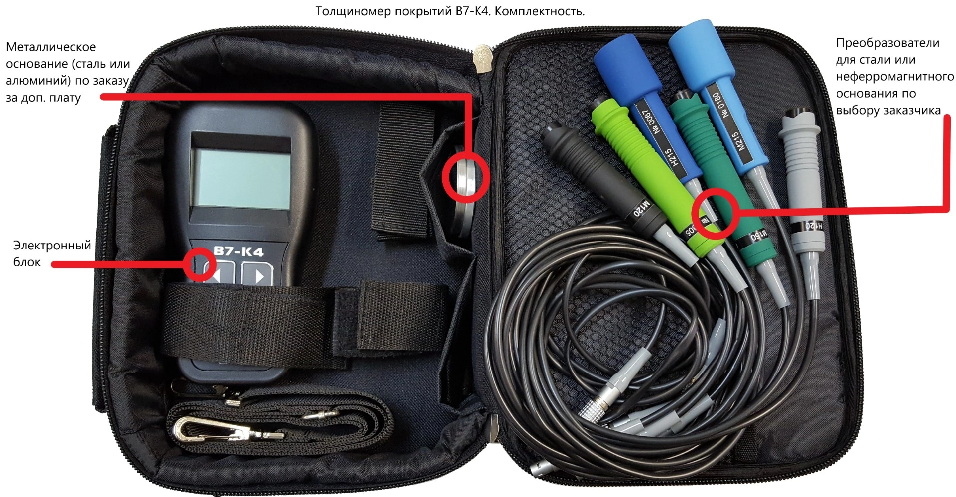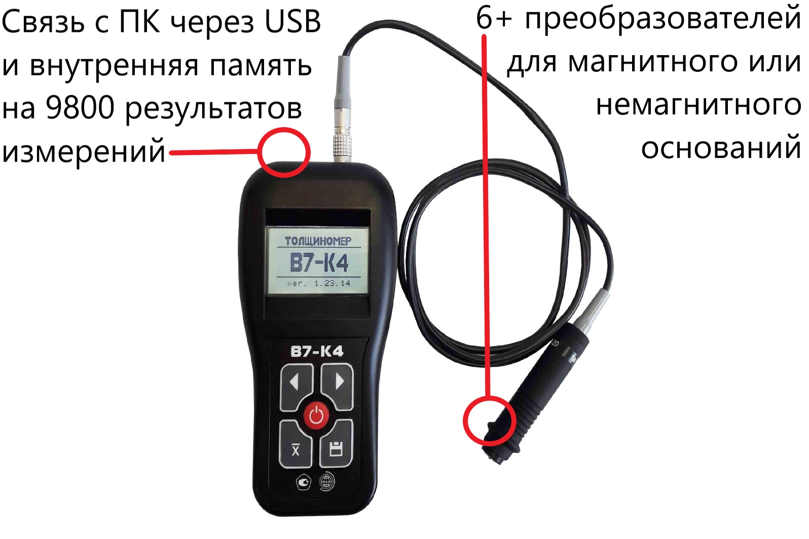 Толщиномеры покрытий модификации В7-К4 с выносным (съёмным) датчиком совмещают два режима работы: магнитный (на низкой частоте) для контроля покрытий на ферромагнитном основании и вихретоковый (на высокой частоте) для контроля покрытий на неферромагнитном основании. Применяются с разными преобразователями в зависимости от требований измерений: