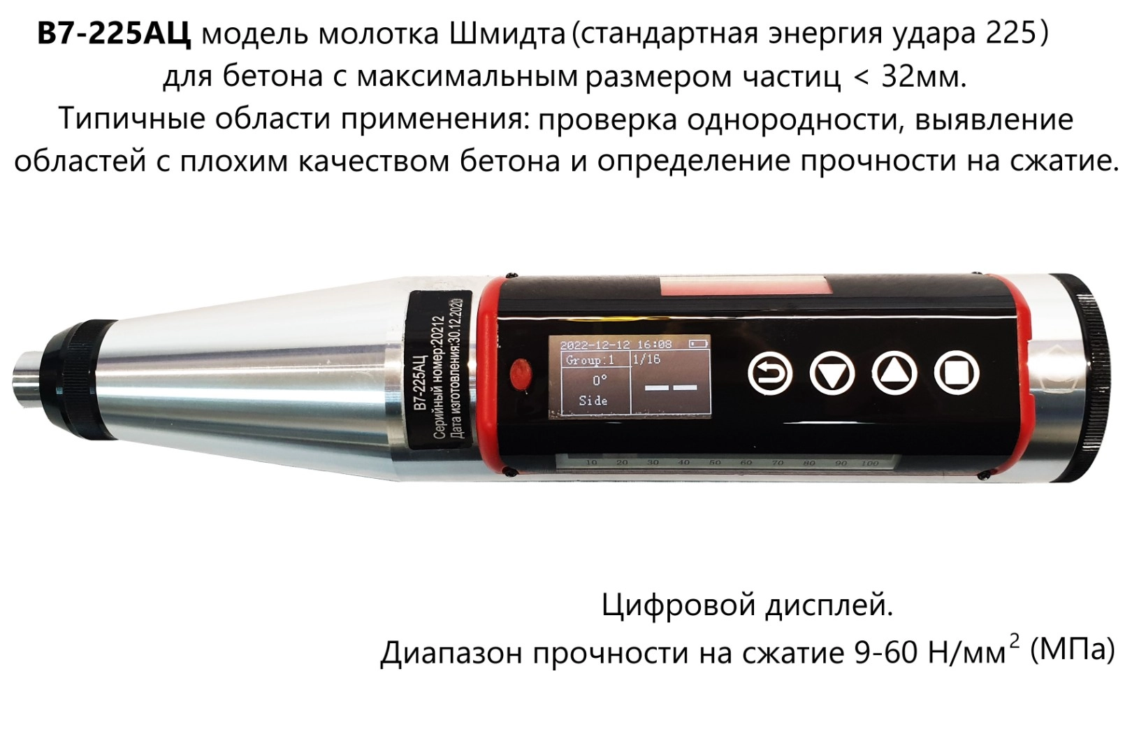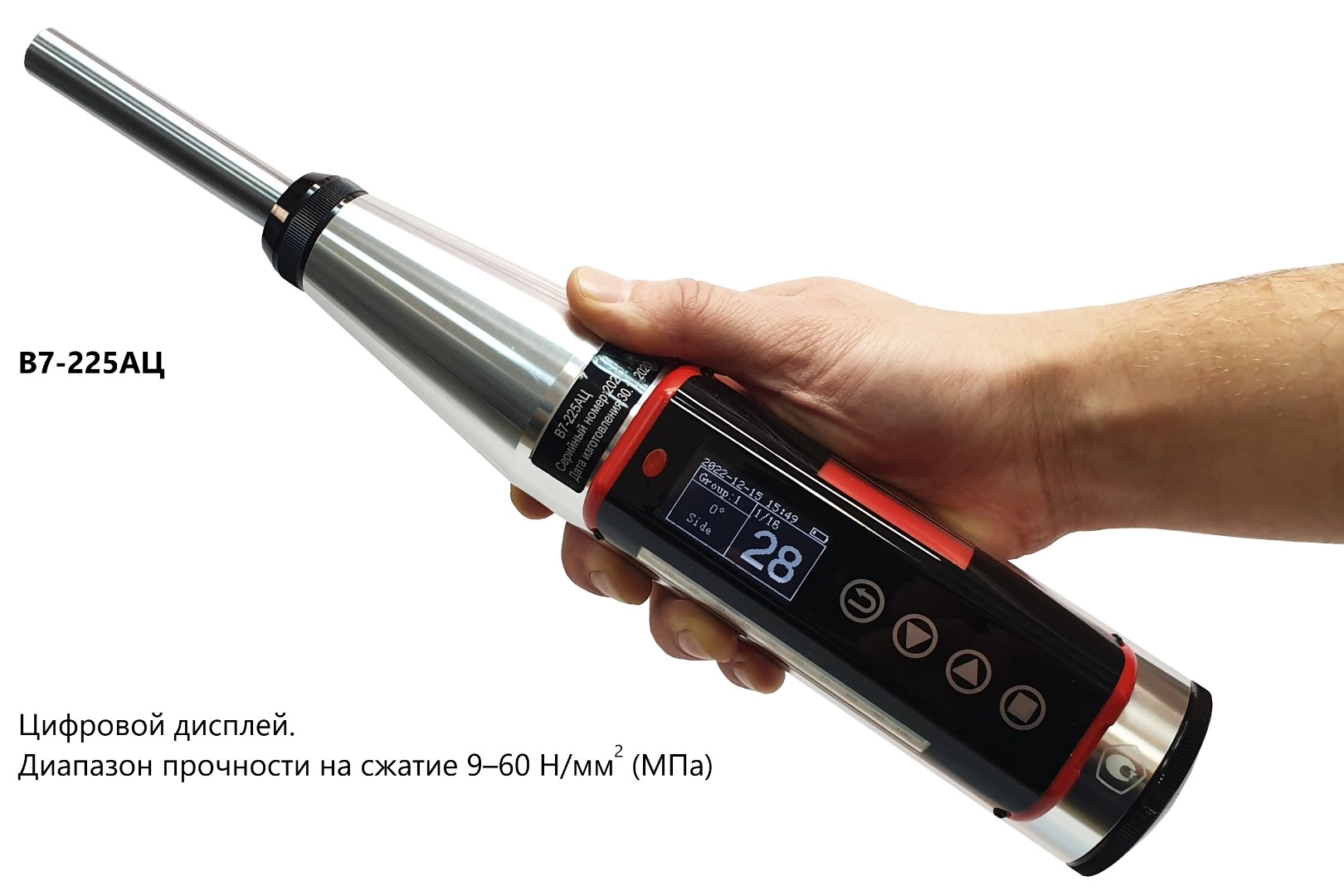 Модель В7-225Ц Склерометр с цифровым индикатором. Диапазон прочности на сжатие 10–70 Н/мм2 (МПа) |