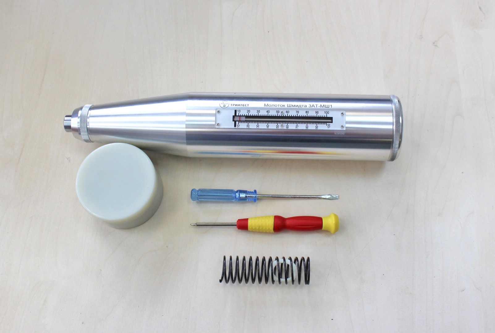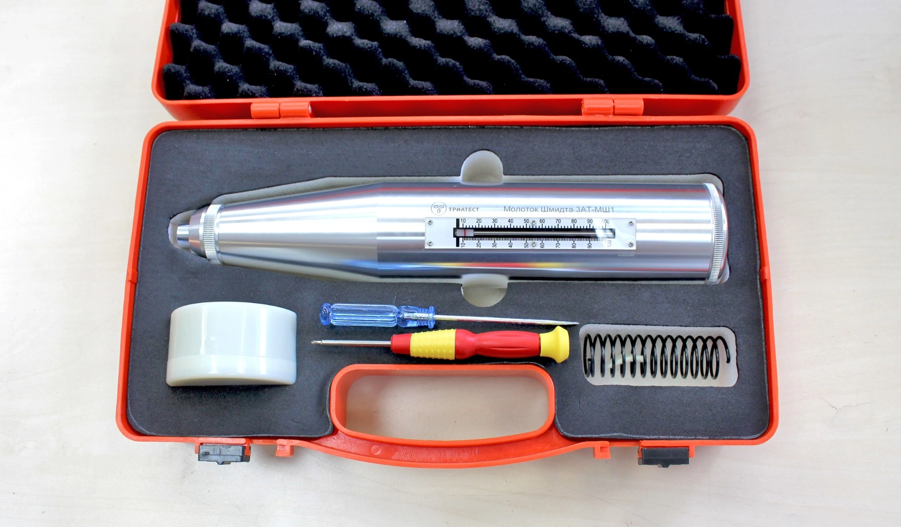 Молоток Шмидта (склерометр) ЗАТ-МШ1 используется для неразрушающего определения прочности бетона (толщиной от 70 мм) в соответствии с требованиями ГОСТ 22690-2015, ГОСТ 18105-2018, ASTM C 805, EN 12 504-2 и ISO 1920. Метод основан на измерении упругого отскока бойка от бетонной поверхности и последующем пересчете полученного значения в единицы прочности на сжатие (МПа) с помощью градуировочных таблиц, прилагаемых к прибору. При этом учитывается положение склерометра в пространстве, а также потенциальное влияние глубины карбонизации бетона на результат. Это один из самых популярных инструментов в мире для оценки прочности бетона.