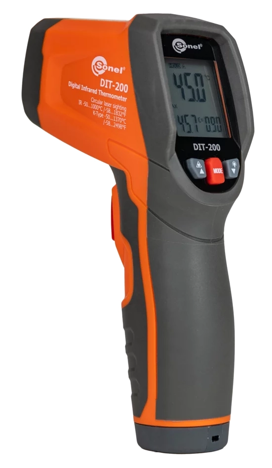 DIT-200 – инфракрасный измеритель температуры (пирометр). Современный прибор, позволяющий бесконтактным методом измерить температуру поверхности любых объектов: электронные компоненты, пластик, металл, дорожные покрытия, пластик, дерево, легко воспламеняемые объекты.