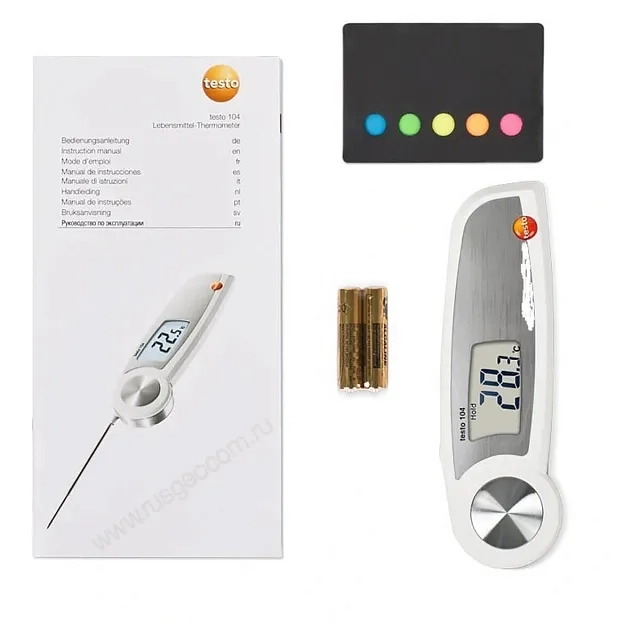 Контактный термометр Testo 104 в водонепроницаемом корпусе предназначен для контроля температуры пищевых продуктов во время хранения и транспортировки. Складная конструкция с поворотным шарниром позволяет выполнять измерения в труднодоступных местах, таких как паллеты или коробки.