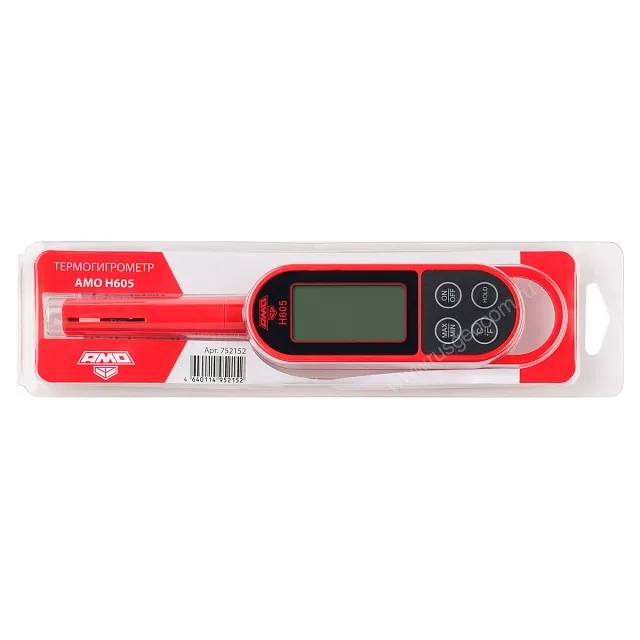 Термогигрометр AMO H605 — это компактный прибор для быстрого измерения температуры и влажности воздуха. Устройство удобно носить с собой и брать на выездные исследования. Чаще всего такое оборудование применяется для проверки качества воздуха в жилых, учебных и рабочих помещениях, а также для контроля режима хранения на складах или в архивах.