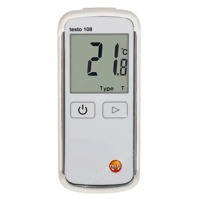 Корпус Testo 108 выполнен из нетоксичного материала, что гарантирует безопасность прибора. Аппарат имеет функцию автовыключения по завершении работы, она помогает более экономно растрачивать заряд батарей. Помимо этого, прибор имеет возможность удержания результатов последних измерений на экране (функция HOLD). Термометр питается от комплекта батарей типа ААА, которых хватает на 10 часов работы при температуре воздуха от +20 до +25°С. Он поставляется вместе со специальным влагозащитным чехлом и проникающим зондом.