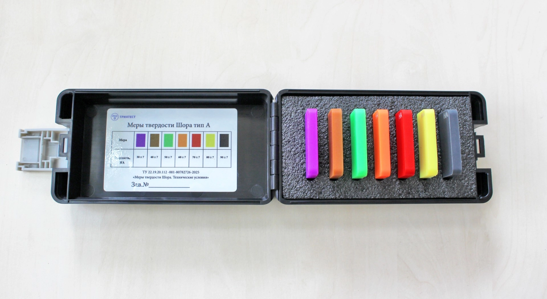 Набор мер твердости Шора типа A (7 шт.) используется для проверки точности и калибровки дюрометров (твердомеров) Шора типа A. Он представляет собой комплект из семи образцов из резины и пластмассы, предназначенных для воспроизведения различных значений твердости в единицах Шора A в соответствии с ГОСТ 263-75, ГОСТ 24621-91 (ISO 868-85) и ГОСТ Р ИСО 7619-1-2009.