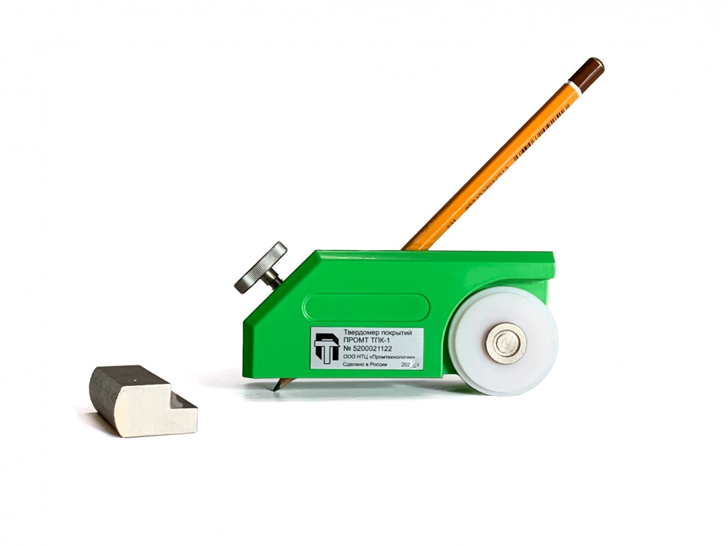Твердомер покрытий по карандашу ПРОМТ ТП-К (прежнее название - Твердомер покрытий по карандашу ПРОМТ ТПК-1) предназначен для контроля твердости и стойкости одно- и многослойных покрытий к царапанию по карандашу в соответствии с ГОСТ Р 54586-2011, ISO 15184 и ASTM D 3363. Метод заключается в воздействии на покрытие карандашами известной твердости с определенной нагрузкой, закрепленными в приборе под заданным углом. При проведении контроля применяют набор карандашей-инденторов различной твердости переходя от наиболее мягкого к более твердому и визуально оценивая повреждения. Результатом контроля будет значение наиболее твердого карандаша не повредившего покрытие, а также характер возникающих в процессе испытания повреждений (пластическая деформация, когезионное разрушение или их сочетание). Метод подходит только для гладких поверхностей. Является модифицированной версией твердомера по карандашу NOVOTEST ТПК-1.