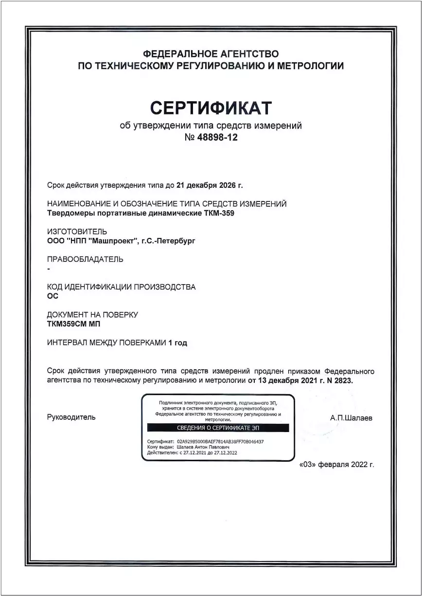 Твердомер ТКМ-359С «Специальный» внесен в Госреестр СИ Российской Федерации. Соответствует требованиям ТР ТС 004/2011 и ТР ТС 020/2011.