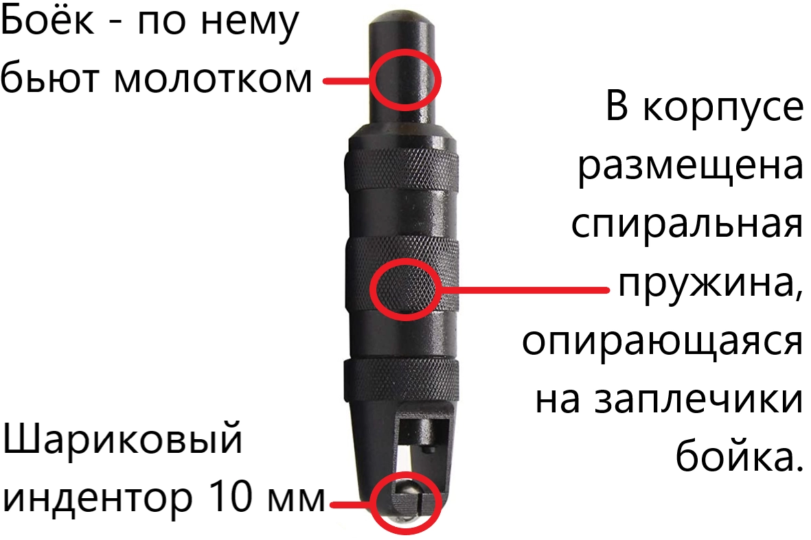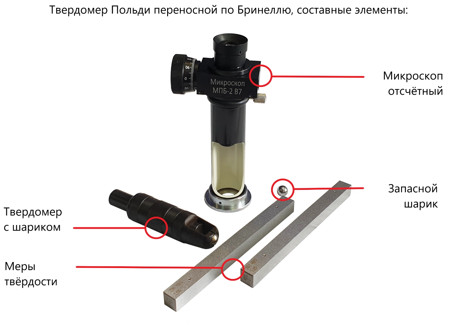 Твердомер переносной Польди ударного действия для стали производит измерение твёрдости методом ударного отпечатка по ГОСТ 18661 – 73. Метод Польди (метод двойного отпечатка шарика) – при ударе молотка по верхней части твердомера стальной шарик диаметром 10 мм вдавливается одновременно в контролируемую деталь и эталонный брусок (меру твёрдости), образуя при вдавливании лунки на обоих изделиях. После этого с помощью микроскопа производится измерение диаметров отпечатков (лунок) и твёрдость детали по Бринеллю определяется с помощью таблиц, прилагаемых к твердомеру.
