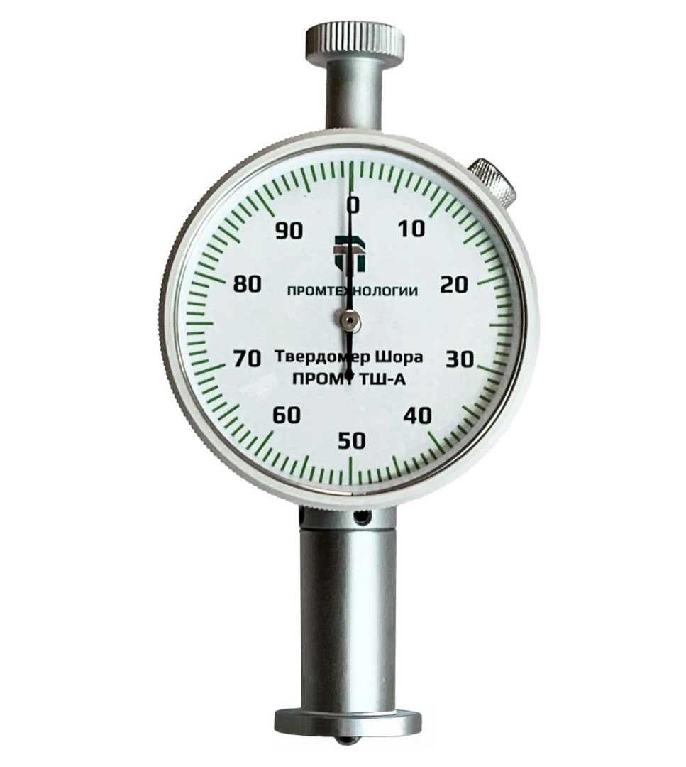 Это простой и надежный механический прибор с металлическим корпусом, индикатором часового типа, поворотным циферблатом для корректной установки нуля и удлиненной контактной площадкой облегчающей применение дюрометра. Внутри устройства установлена тарированная пружина обеспечивающая требуемое усилие на индентор специальной формы из закаленной стали и механизм фиксации его перемещения. Для проведения измерения в соответствии с ГОСТ также потребуется секундомер и термометр. Твердомер Шора ПРОМТ ТШ-А (тип АО/С) не требует специальных навыков для работы с ним и позволяет оперативно контролировать твердость мягких резины и пластиков, силикона, винила и аналогичных материалов в лабораторных и цеховых условиях.