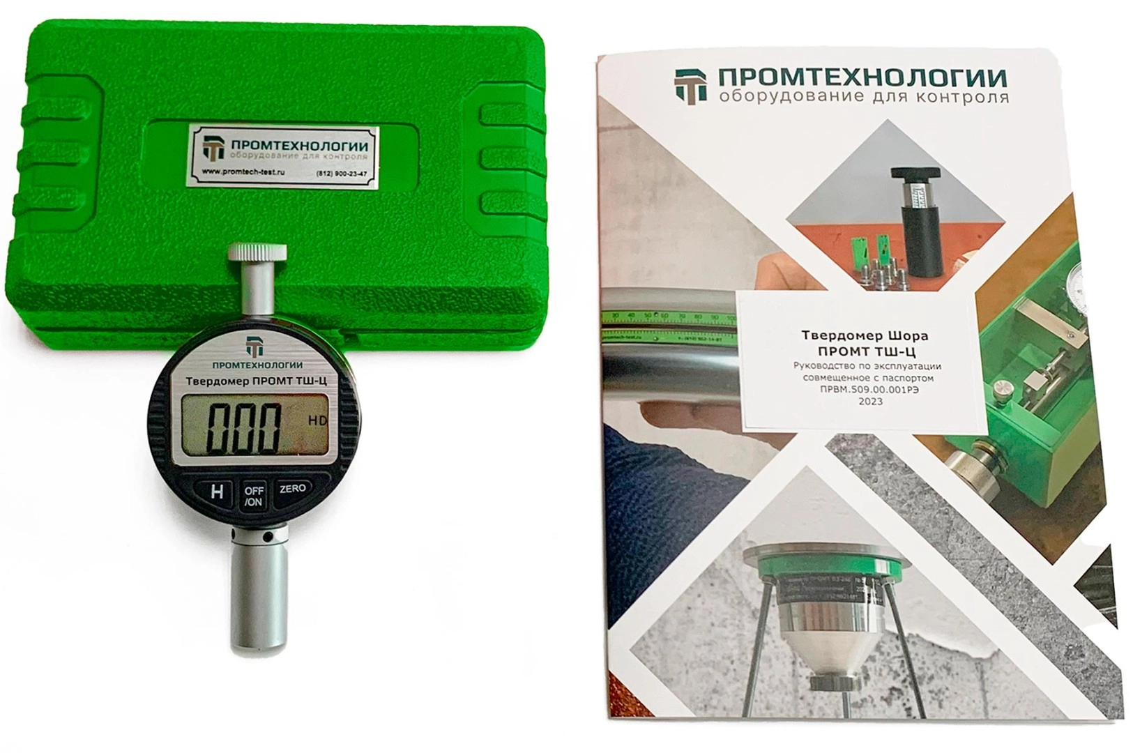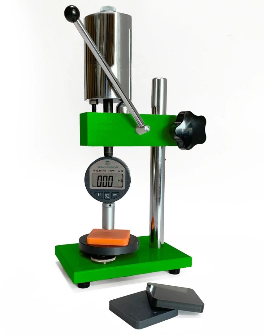 Твердомер по Шору (дюрометр) ПРОМТ ТШ-Ц (тип D) используется для контроля твердости эбонита, пластмасс, твердой резины и аналогичных материалов по методу Шора в соответствии с ГОСТ 24621-2015 и ГОСТ Р ИСО 7619-1-2009. В основу метода положено определение глубины вдавливания индентора определенной формы под воздействием заданной силы в течение необходимого времени. За результат измерения принимается значение твердости в единицах Шора D (HD) в диапазоне от 0 до 100 отображаемое на дисплее. Температура воздуха и материала являются важными параметрами при проведении испытания и определяется ГОСТ либо нормативными документами на объект испытания. Относительная влажность также может влиять на твердость некоторых материалов. Представляет из себя модифицированную версию твердомера по Шору NOVOTEST ТШ-Ц.