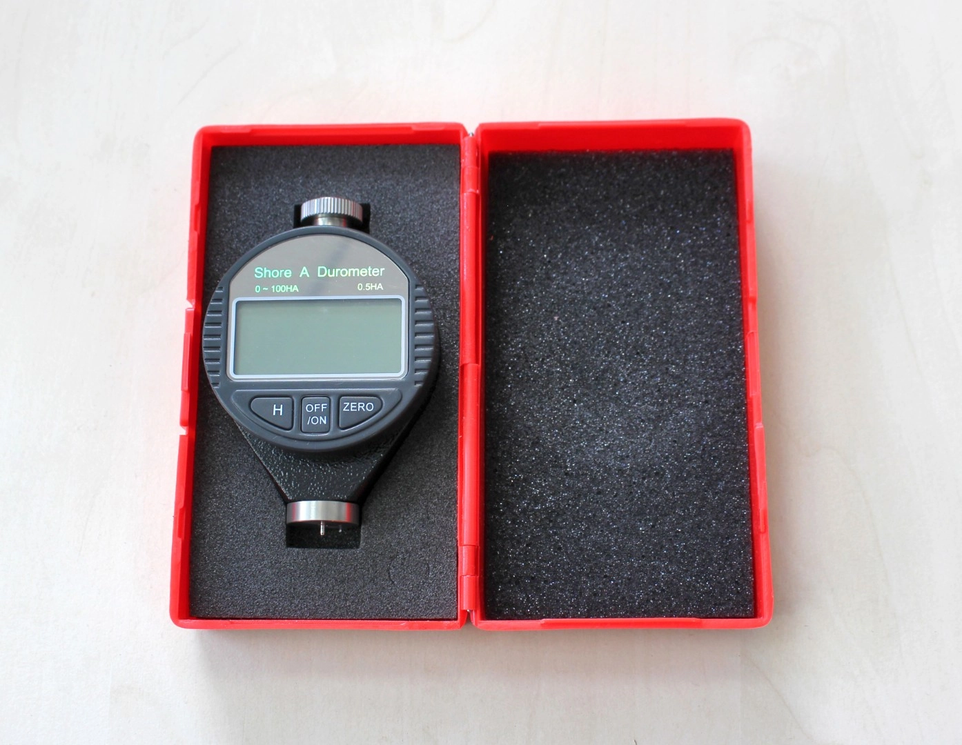 Корпус прибора выполнен из прочного ABC-пластика и оснащен LCD-дисплеем, кнопками для установки нуля и фиксации показаний, а также удлиненной контактной площадкой для удобства использования. Встроенная тарированная пружина обеспечивает необходимое усилие на индентор из закаленной стали специальной формы, а механизм фиксации перемещения индентора фиксирует полученное значение. Для проведения измерений в соответствии с ГОСТ также потребуются секундомер и термометр. Твердомер Шор тип А прост в эксплуатации и позволяет быстро контролировать твердость мягких резин, пластиков, силикона, винила и подобных материалов как в лабораторных, так и в производственных условиях.