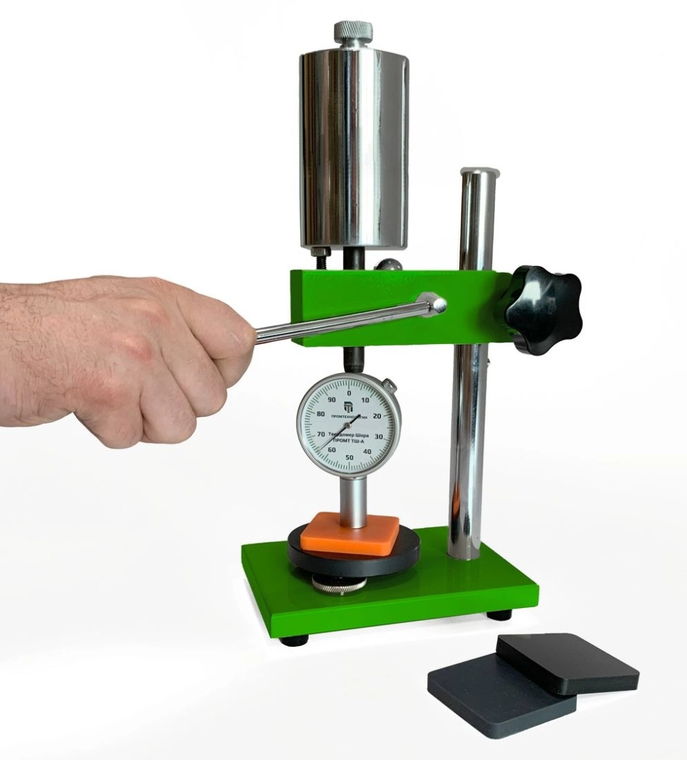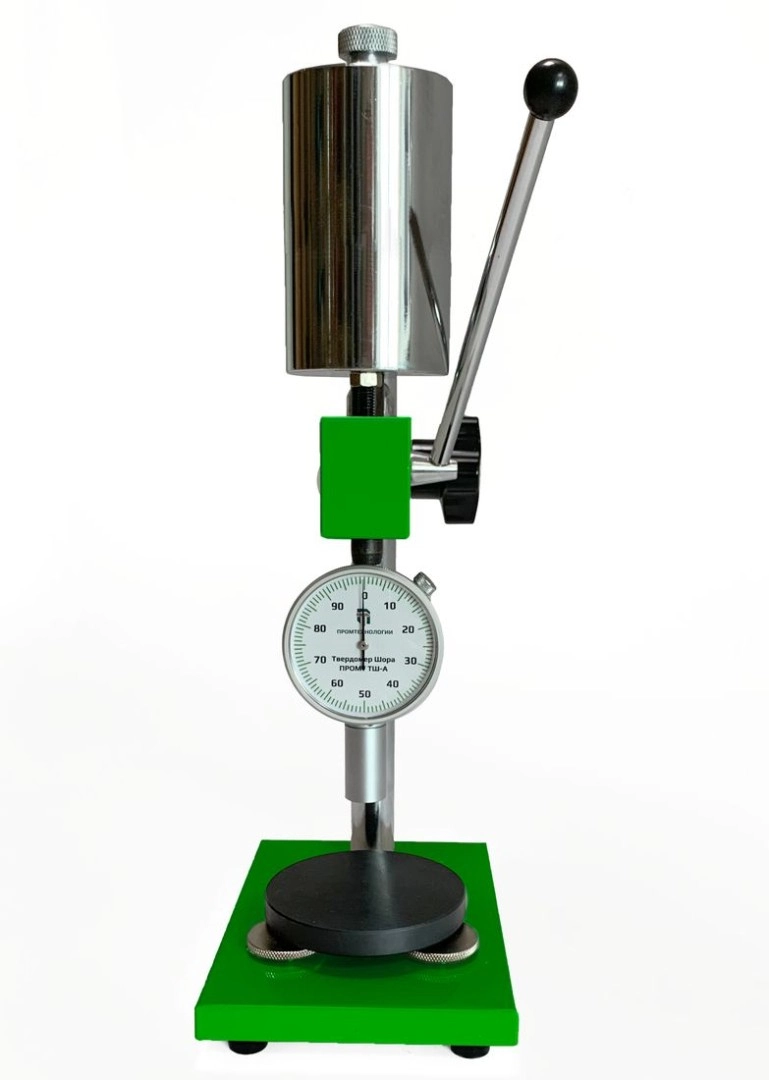Это простой и надежный механический прибор с металлическим корпусом, индикатором часового типа, поворотным циферблатом для корректной установки нуля и удлиненной контактной площадкой облегчающей применение дюрометра. Внутри устройства установлена тарированная пружина обеспечивающая требуемое усилие на индентор специальной формы из закаленной стали и механизм фиксации его перемещения. Для проведения измерения в соответствии с ГОСТ также потребуется секундомер и термометр. Твердомер Шора ПРОМТ ТШ-А (тип D) не требует специальных навыков для работы с ним и позволяет оперативно контролировать твердость жесткой резины, пластиков, эбонита, смолы и аналогичных материалов в лабораторных и цеховых условиях.