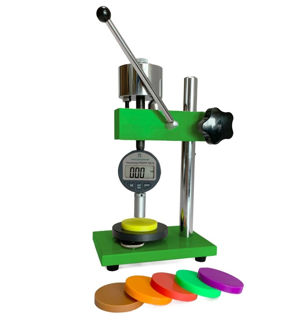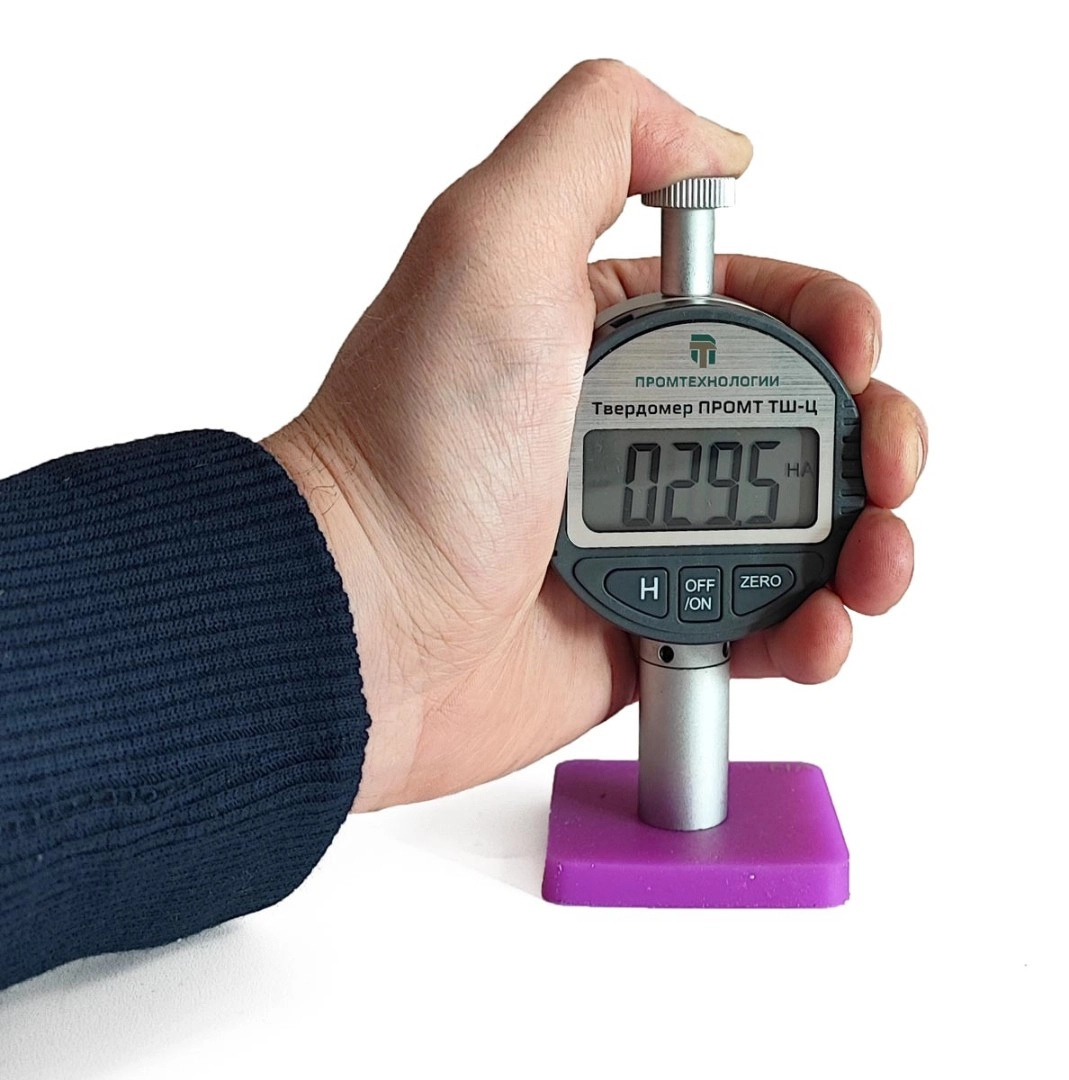 Твердомер по Шору (дюрометр) ПРОМТ ТШ-Ц (тип А) используется для контроля твердости мягкой резины и аналогичных материалов по методу Шора в соответствии с ГОСТ 263-75, ГОСТ 24621-2015 и ГОСТ Р ИСО 7619-1-2009. В основу метода положено определение глубины вдавливания индентора определенной формы под воздействием заданной силы в течение необходимого времени. За результат измерения принимается значение твердости в единицах Шора А (HA) в диапазоне от 0 до 100 отображаемое на цифровом дисплее. Температура воздуха и материала является важным параметром при проведении испытания и определяется ГОСТ либо нормативными документами на объект испытания. Относительная влажность также может влиять на твердость некоторых материалов. Представляет из себя модифицированную версию твердомера по Шору NOVOTEST ТШ-Ц.