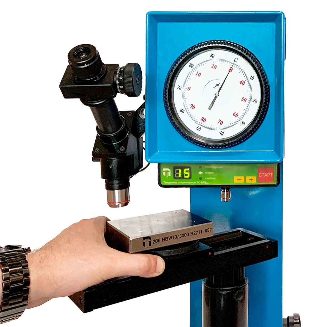 Твердомер стационарный Бринелля, Роквелла и Виккерса ТС-БРВ подключается к сети 220 В, имеет металлический корпус, встроенный микроскоп и рабочий стол с подвижной площадкой. В стандартную комплектацию входят 4 типа инденторов, 3 вида рабочих столов и несколько мер твердости для калибровки прибора. Поставляется поверенным.