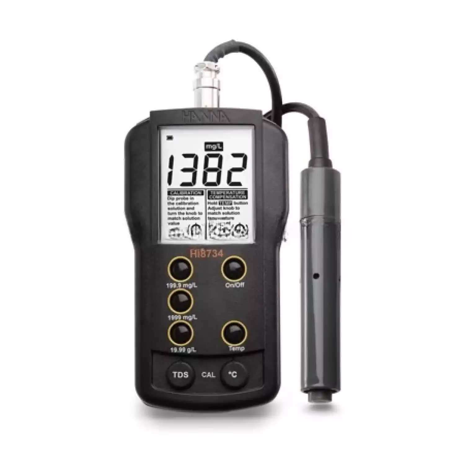 Кондуктометр HI 8734 многодиапазонный портативный измеритель разработан для использования в процессах водоочистки, особенно при умягчении воды, её деминерализации, в процессах обратного осмоса, а также при работах с питьевой водой. Прибор позволяет проводить измерения в трёх рабочих диапазонах в пределах величин TDS от 0,0 мг/л до 19,99 г/л с точностью ± 1% от полной шкалы измерений. Входящий в комплект прибора четырёхэлектродный датчик проводимости HI76301D позволяет проводить измерения в широком диапазоне концентраций с помощью одного датчика.
