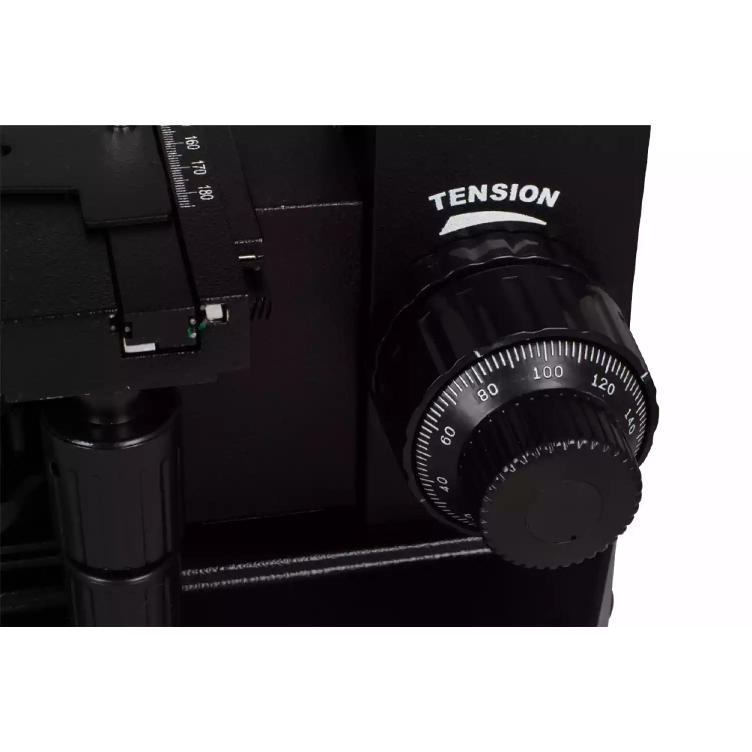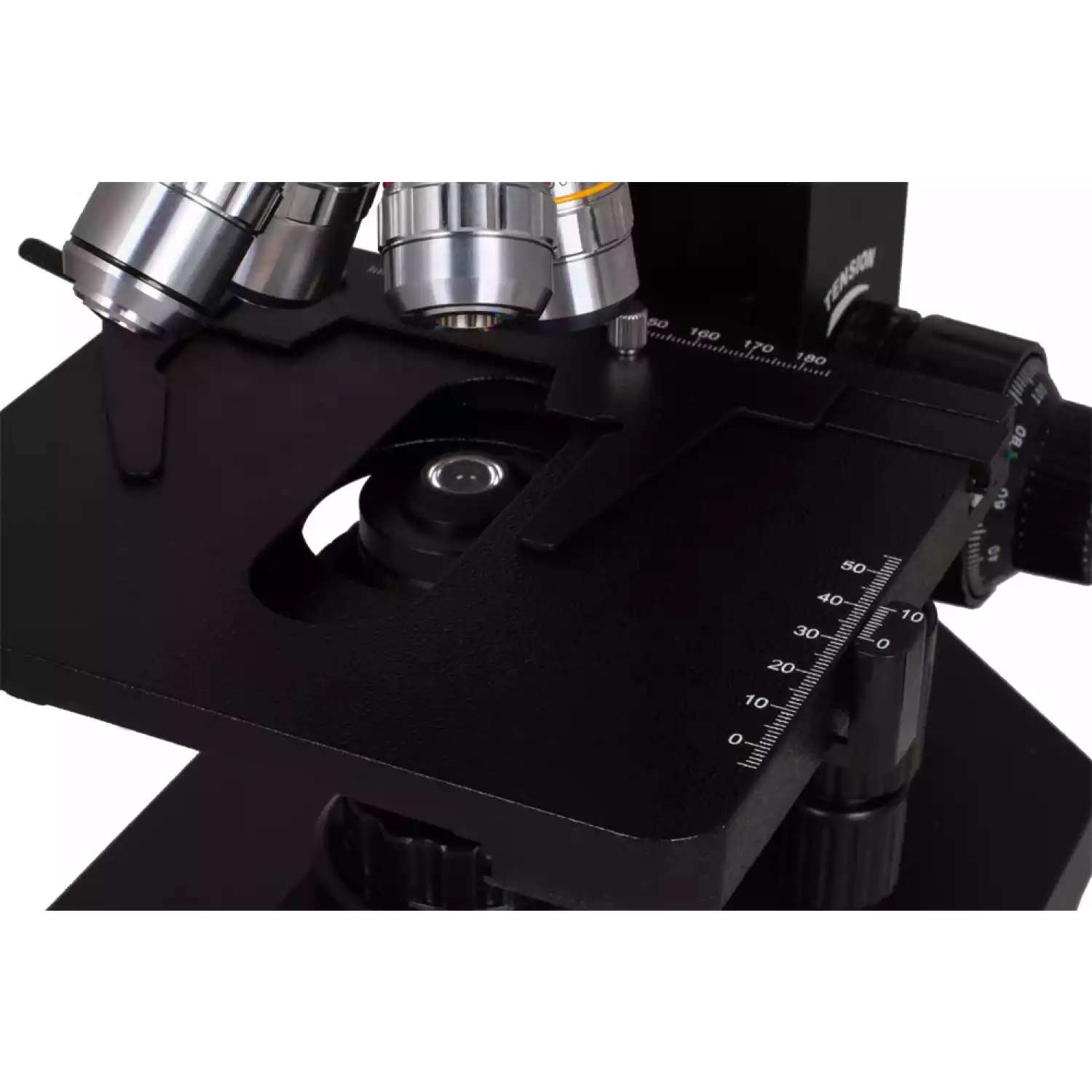 Фокусировка микроскопа Levenhuk 850B производится за счет винтов грубой и точной настройки резкости. Рукоятки фокусировки позволяют перемещать предметный столик в вертикальной плоскости для точного наведения микроскопа, который остается неподвижным. Также столик можно передвигать и в горизонтальном направлении. Общий размер столика 140×155 мм. Благодаря мягкому ходу фокусировки и механизма перемещения столика все настройки происходят плавно, без рывков. Фокусировка имеет следующие шаги: грубая 25 мм, точная 0,002 мм.