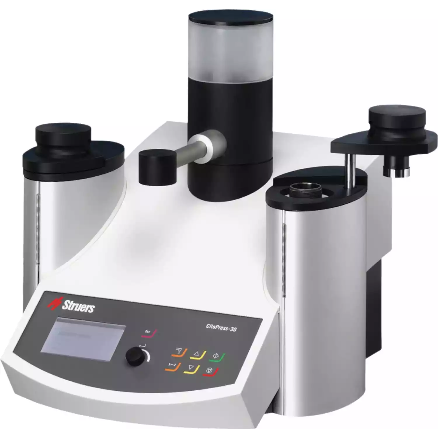 Автоматический электрогидравлический пресс CitoPress-30 для горячей запрессовки образцов с одним или двумя запрессовочными блоками. Горячая запрессовка образцов позволяет избежать завала края образца при последующей пробоподготовке, а также делает процесс шлифования и полирования более легким и быстрым..