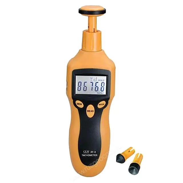 Цифровой тахометр AT-8 – это функциональный прибор, предназначенных для измерения количества оборотов двигателей, валов, роторов и других движущихся механизмов за единицу времени как контактным, так и бесконтактным способом при помощи специальных насадок. Тахометр AT-8 способен регистрировать вращение со скоростью от 2 до 20000 оборотов в минуту (контактный метод) и от 2 до 99999 оборотов в минуту (бесконтактный метод) с точностью 0,05% ±1 знак. Кроме этого вы можете измерять частоту вращения и скорость перемещения поверхности в различных единицах измерений.