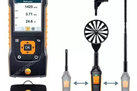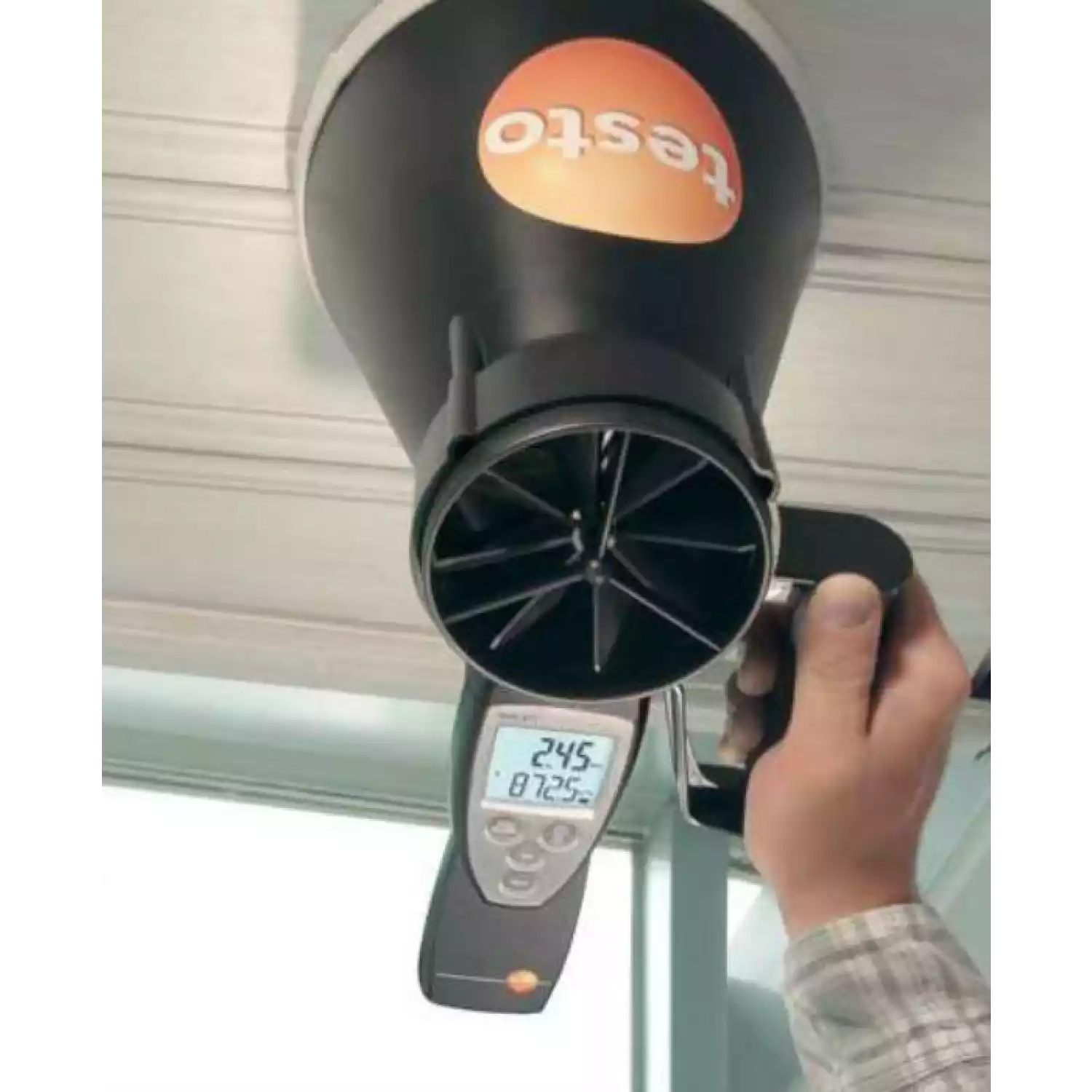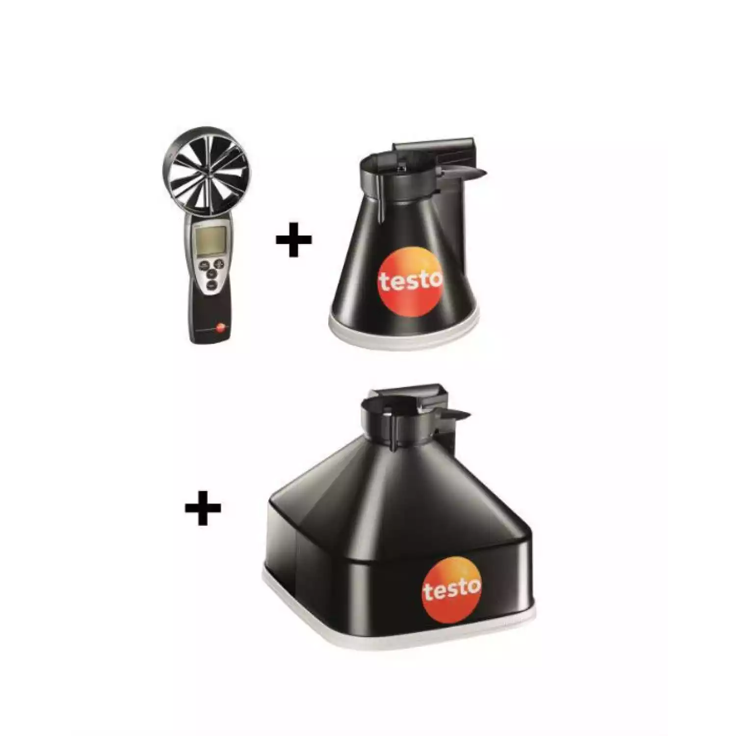 Комплект состоит из анемометра с крыльчаткой testo 417 и набора измерительных воронок testovent 417, который в свою очередь состоит из двух воронок: для измерений на тарельчатых клапанах и для измерений на вентиляционных решетках.